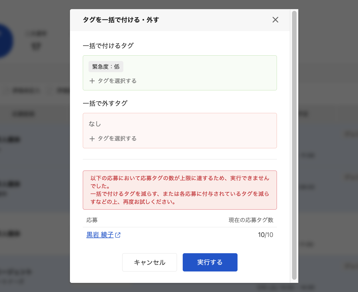 応募に付与できるタグの上限は最大10個のため、一括付与対象の中にすでにタグが10件付与されている応募がある場合、以下の通りエラーが発生します。