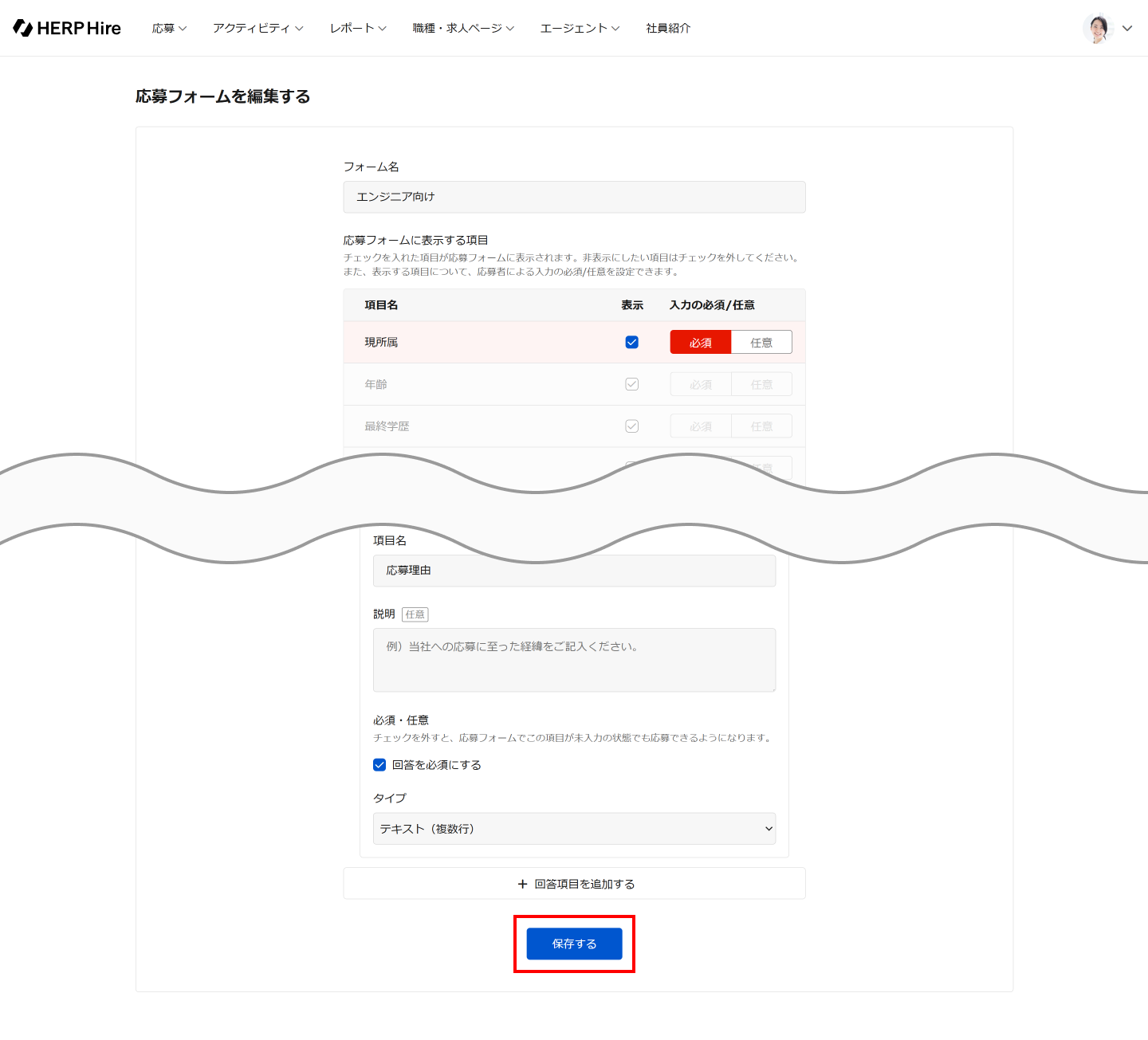 「フォーム名」、「応募フォームに表示する項目」、「追加項目」を設定し、「保存する」をクリックすると応募フォームを作成できます。