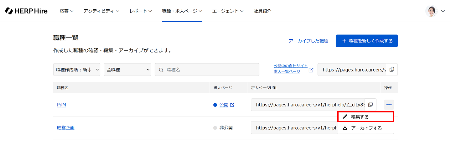 職種一覧から応募フォームの設定をしたい職種の右部にある「…」をクリックして、「編集する」をクリックします。