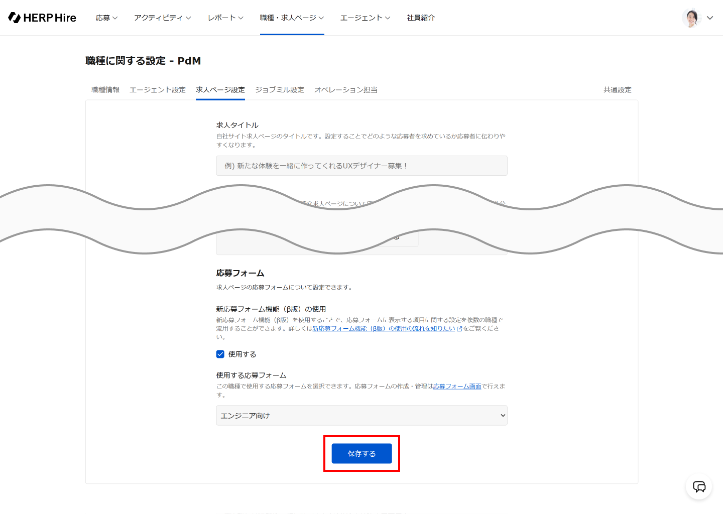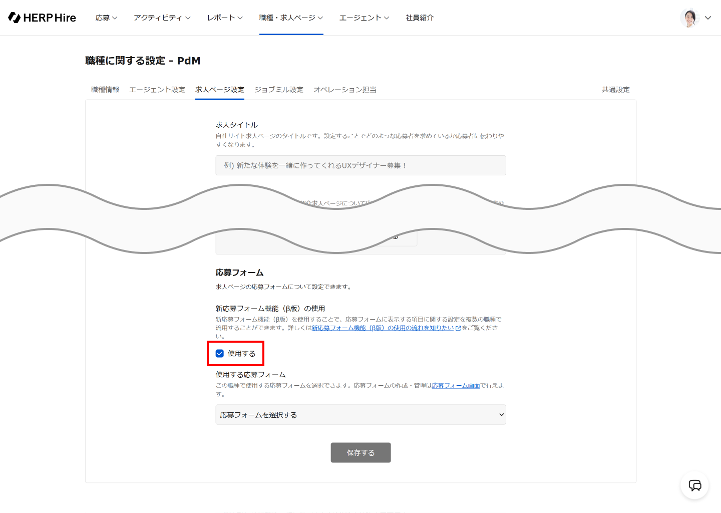 「新応募フォーム機能(β版)の使用」の「使用する」にチェックをつけます。