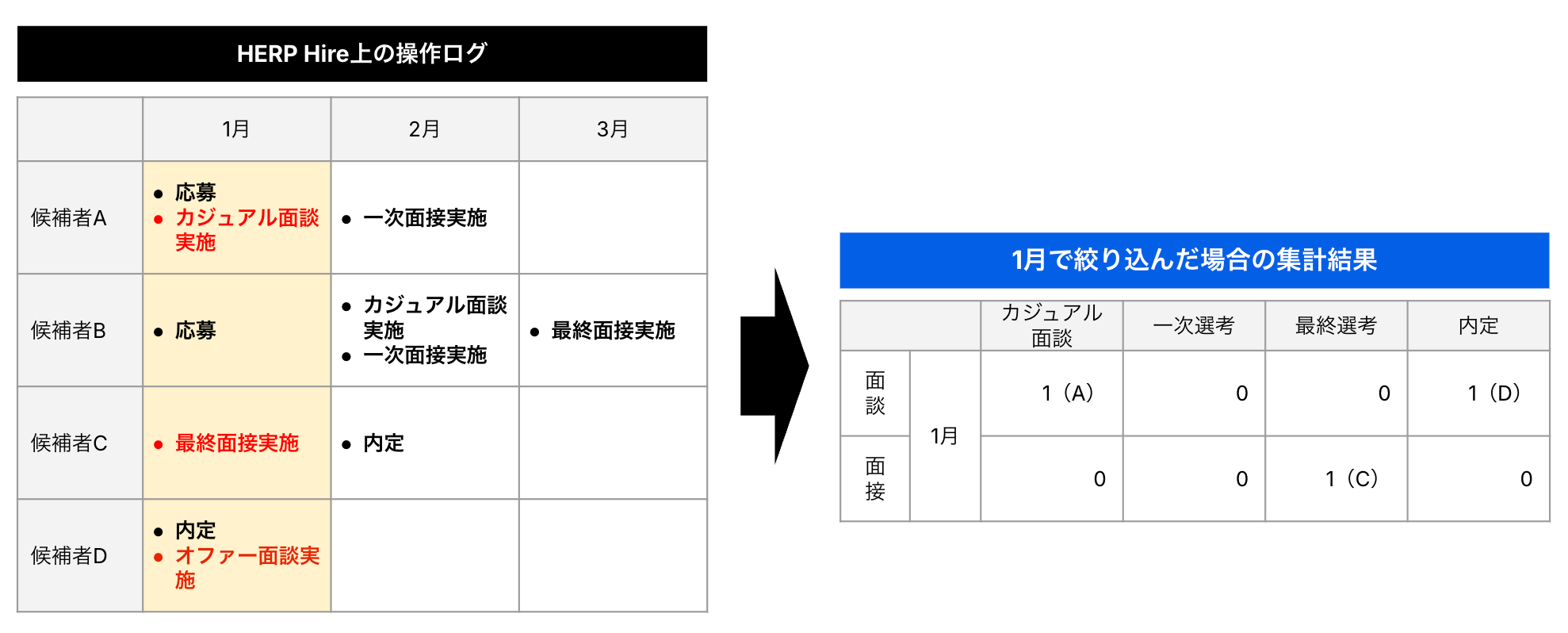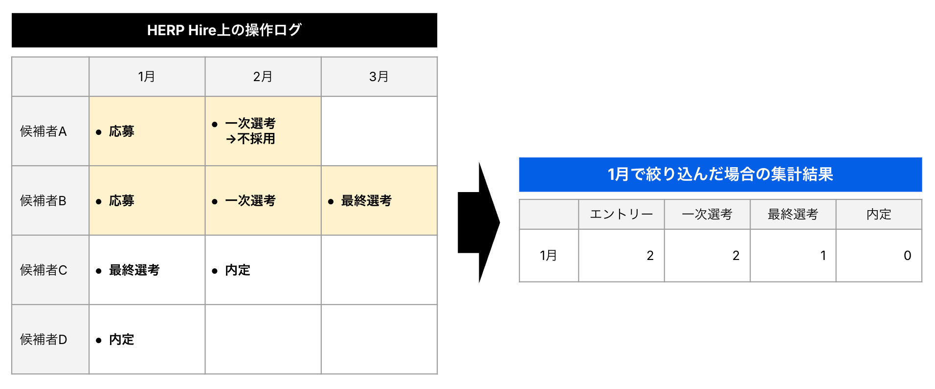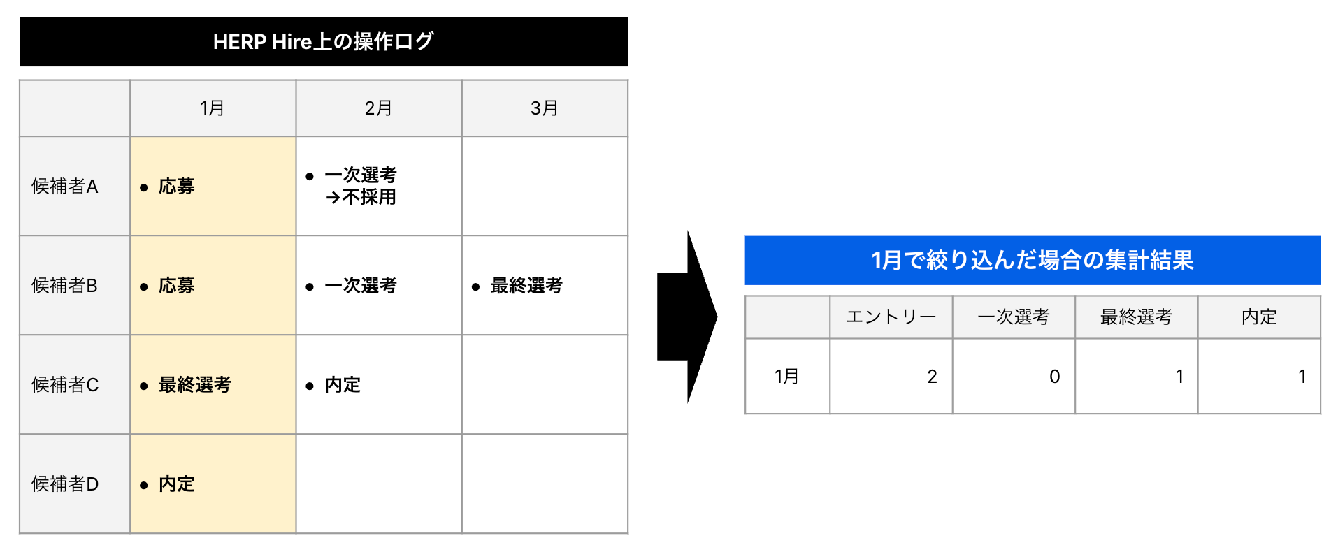 応募日を1月に絞り込んだ場合、1月の応募した候補者A・Bがどこまで進捗したかが集計されます。