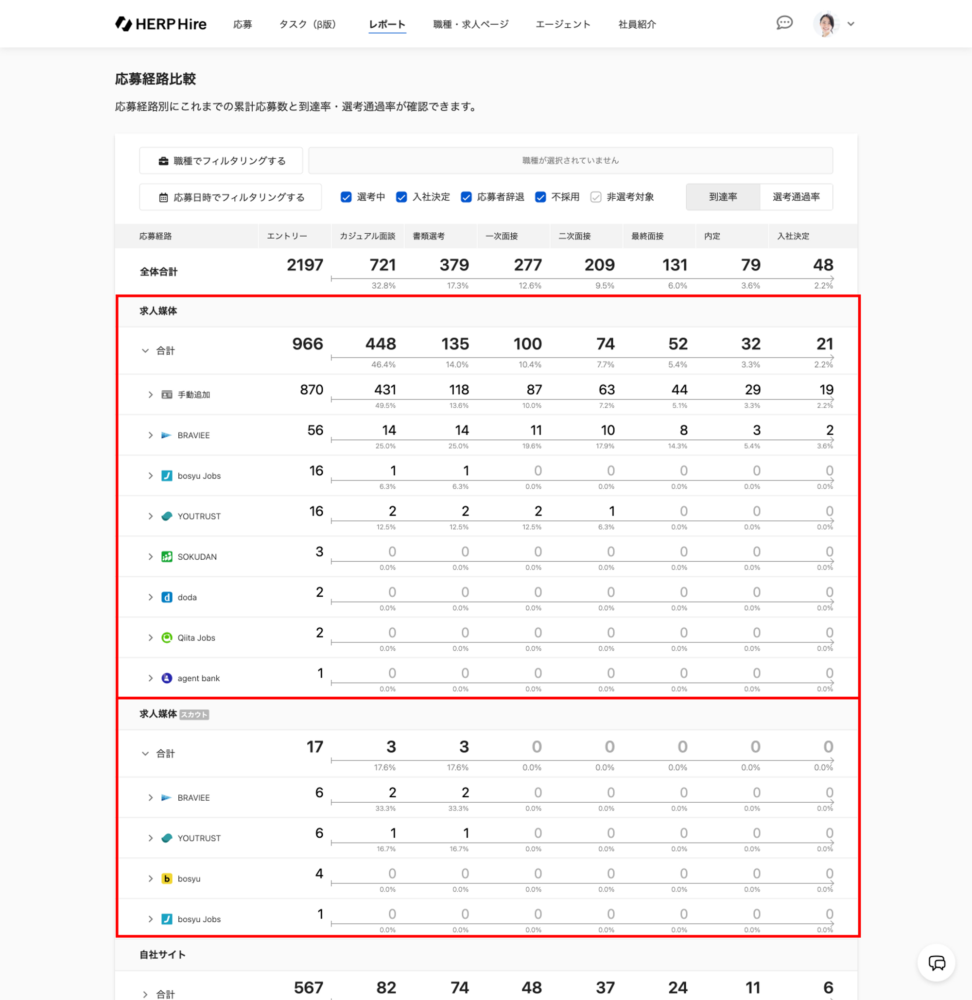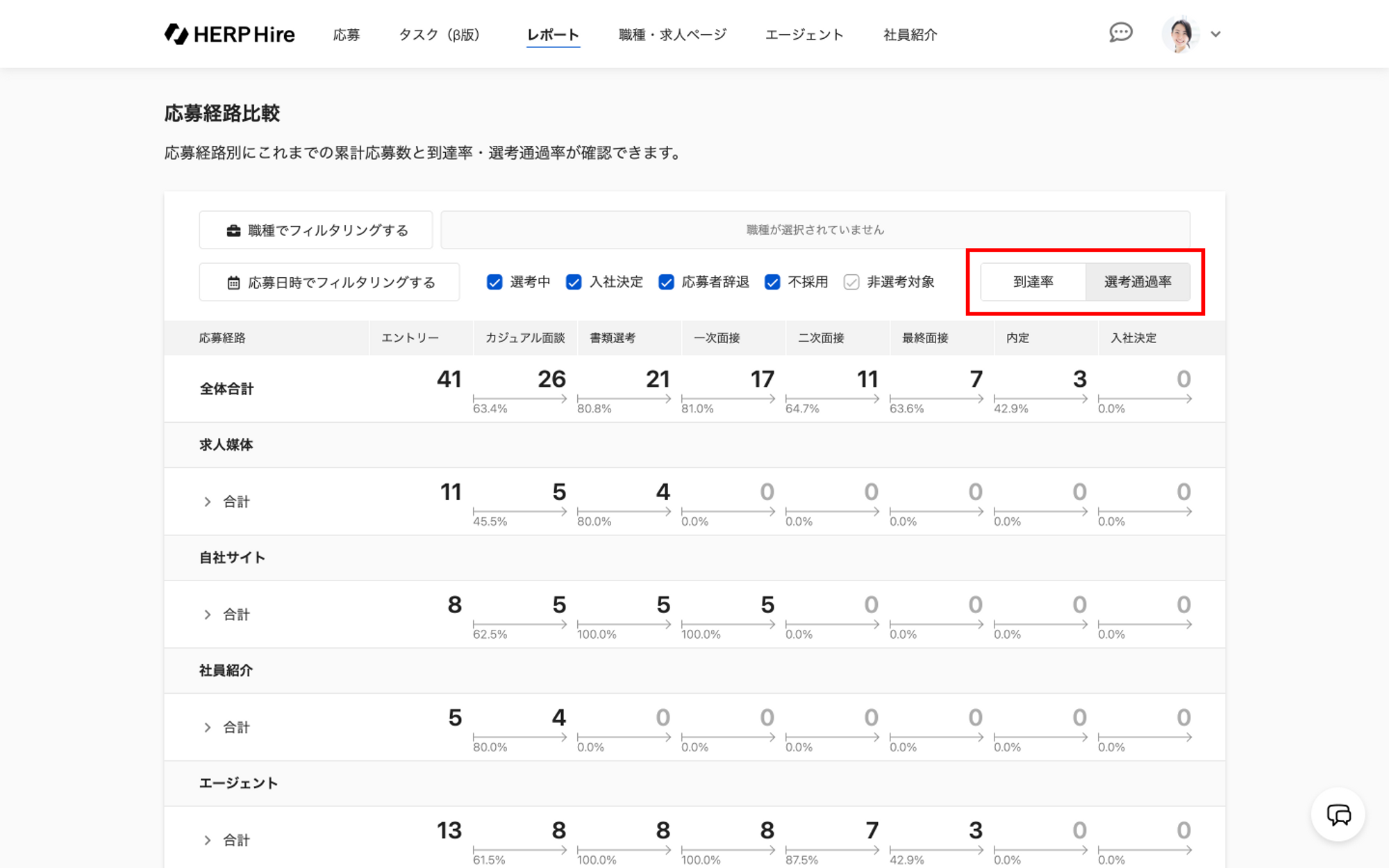 応募経路別に各選考ステップの応募者数、到達率、選考通過率を確認するためのレポートの使い方をご案内します。