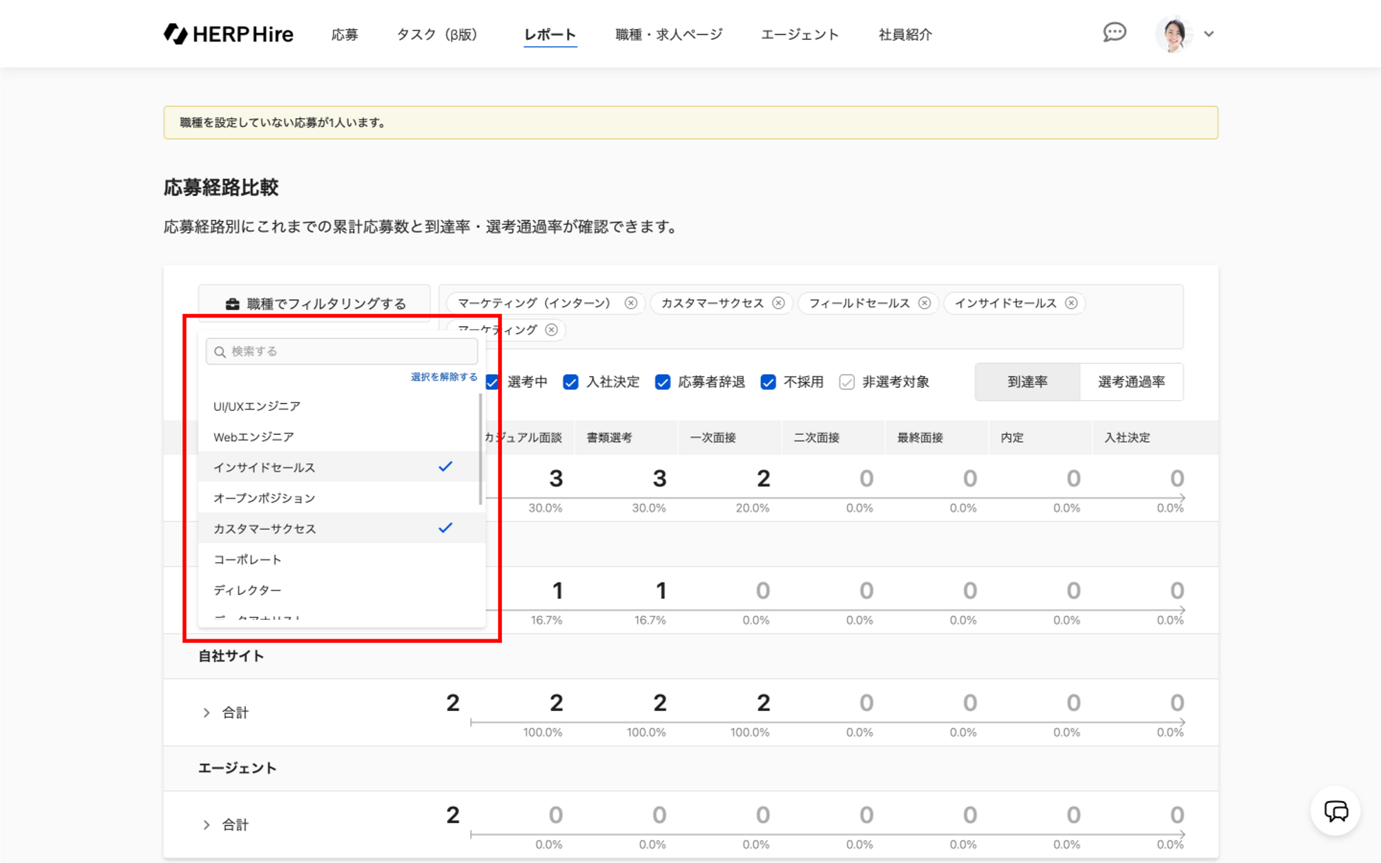 応募者の職種が「職種未設定」となっている場合は本レポートに表示されないため、応募者情報で職種の設定(ガイド)をしてください。