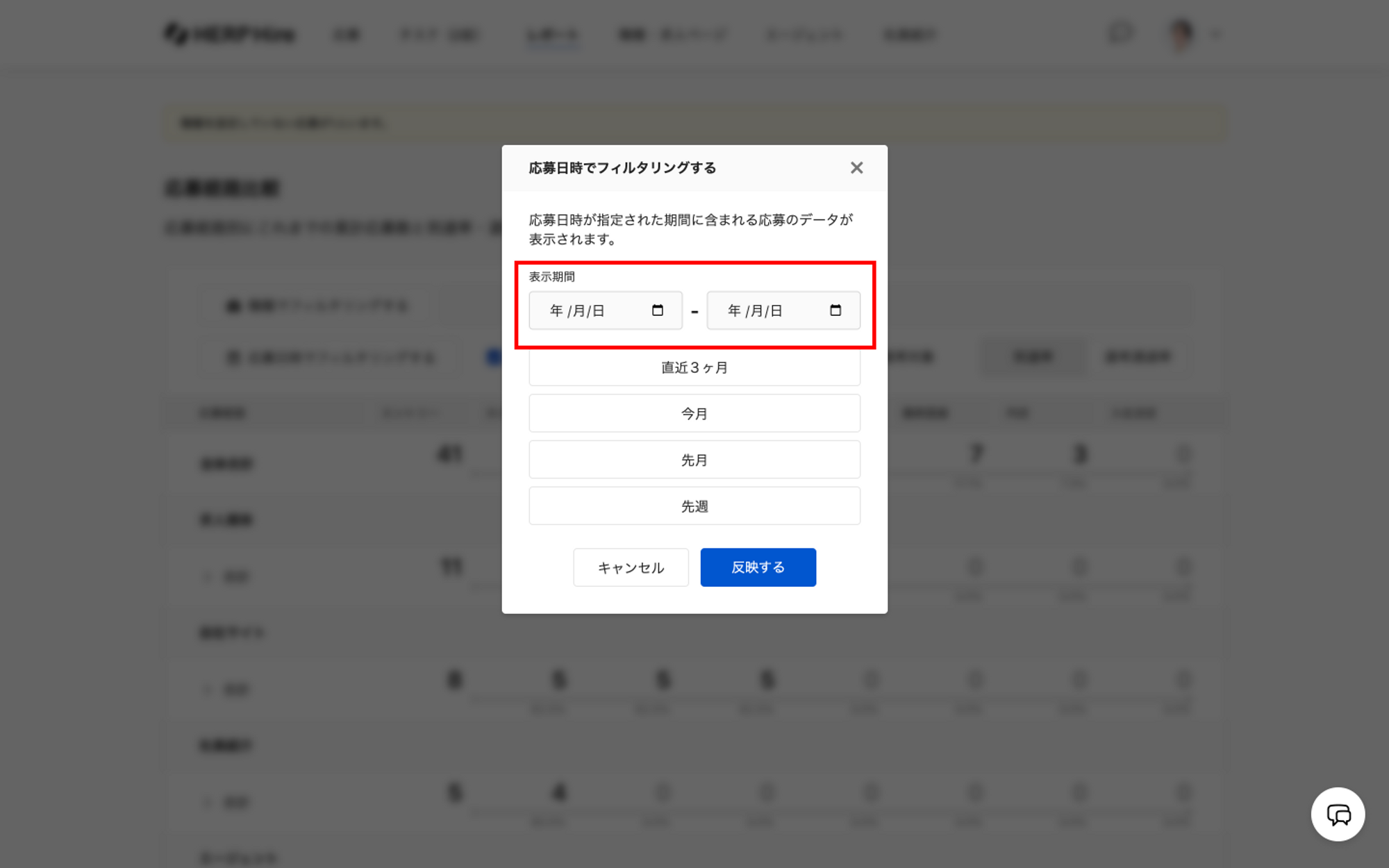 応募日時で絞り込みをしている場合、フィルタ設定が正しく設定されているかをご確認ください。