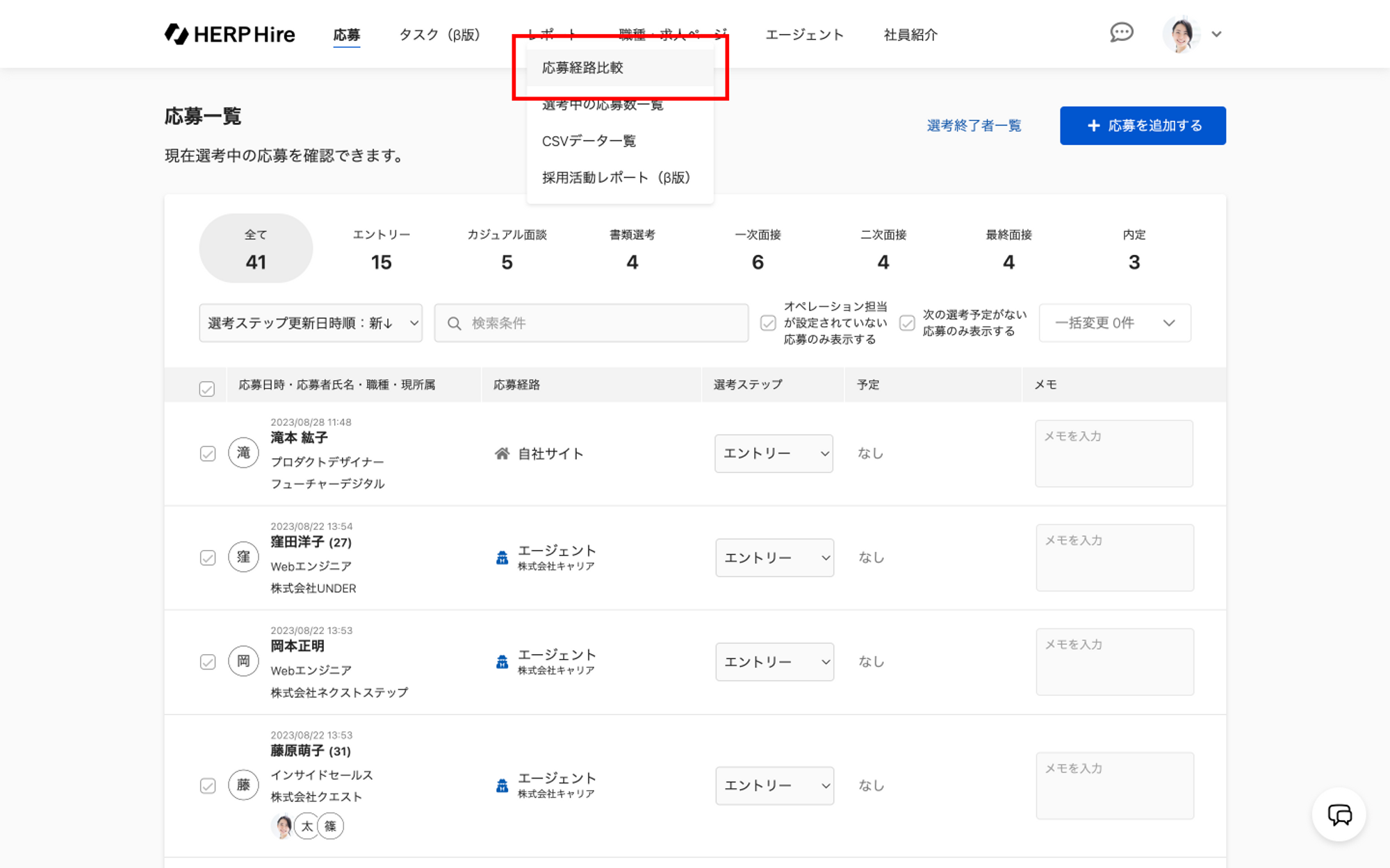 「レポート」にカーソルをかざし、「応募経路比較」をクリックします。