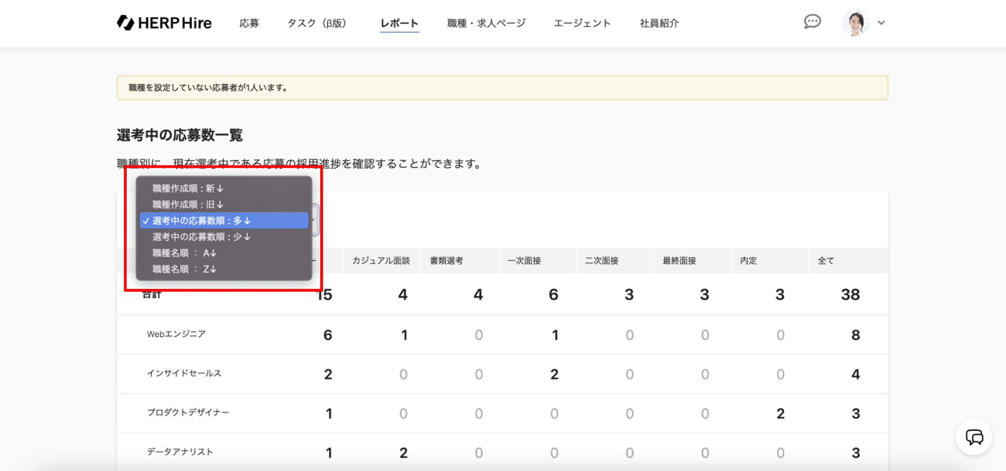 職種を設定していない応募者の状況は表示されません。この場合、ページ上部に「職種を設定していない応募者が○人います」のメッセージが表示されます。
