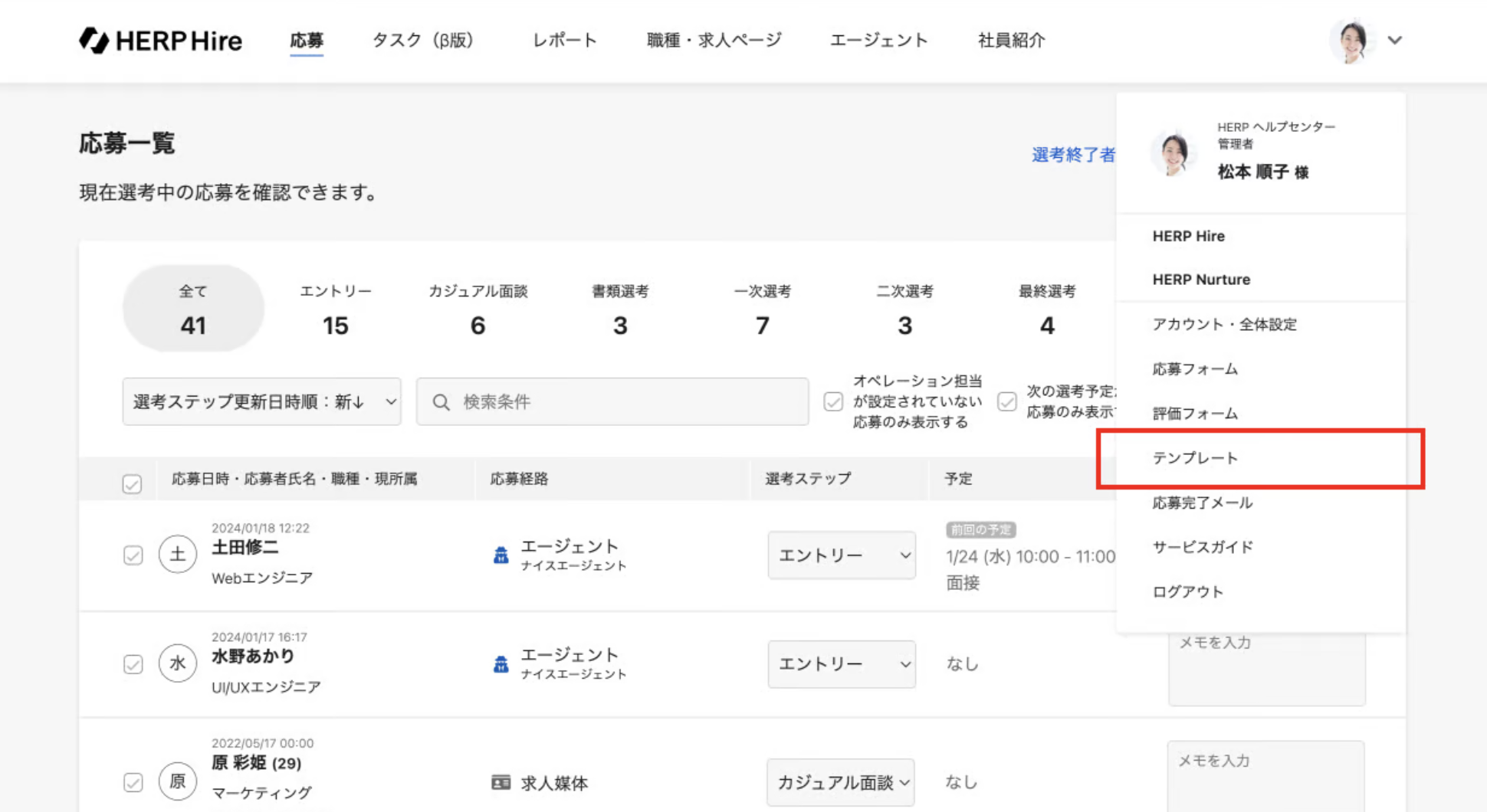 編集したい応募者メールテンプレートの「編集する」をクリックし、表示されたリストから「テンプレートを編集する」をクリックします。
