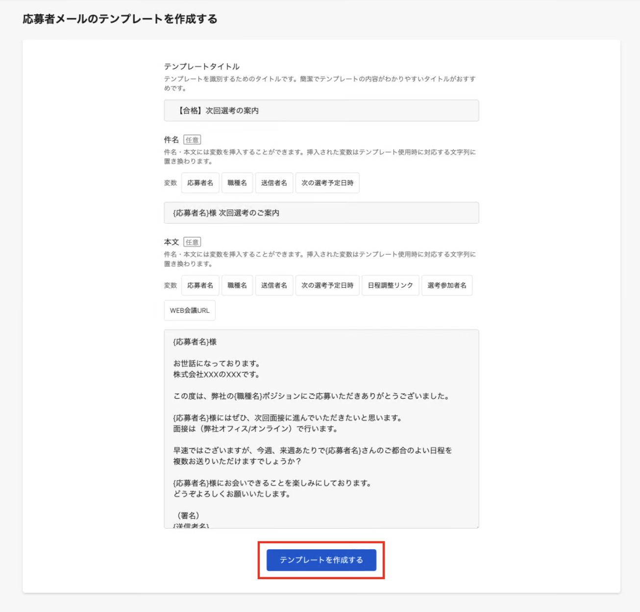 必要な情報を入力して「テンプレートを作成する」をクリックすると、応募者メールテンプレートの作成は完了です。