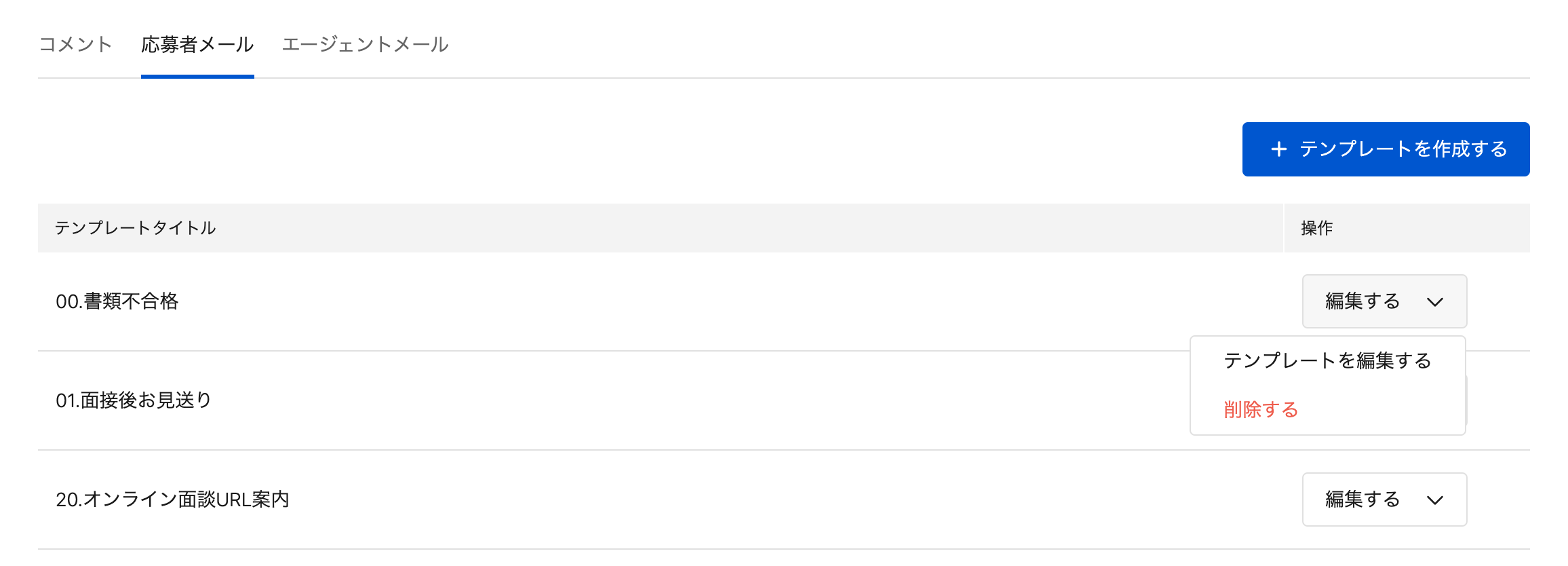 編集したい応募者メールテンプレートの「編集する」をクリックし、表示されたリストから「削除する」をクリックします。