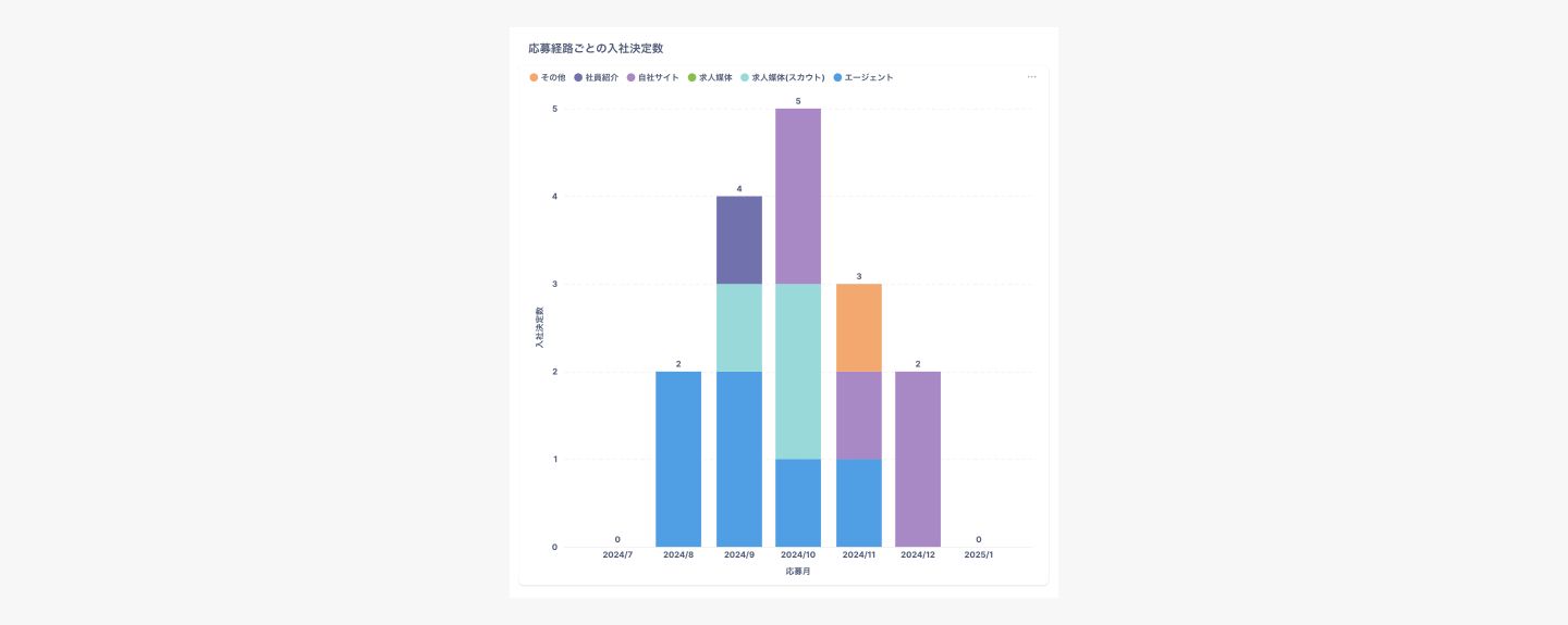 応募経路ごとの入社決定数を、応募月別に確認できます。