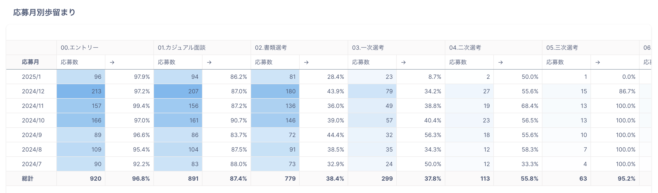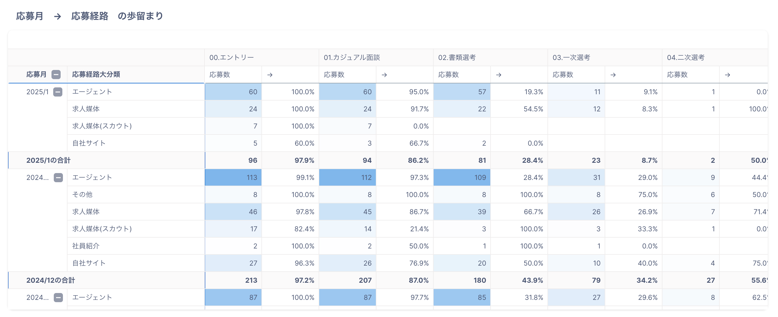 各応募月の応募経路別に各選考ステップの歩留まりを確認できます。