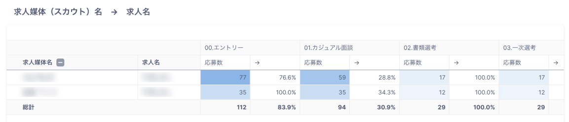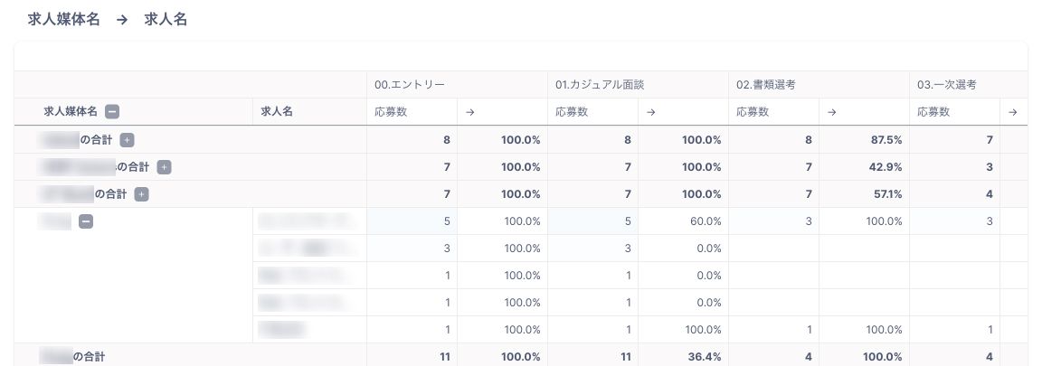 フィルタリングした期間の、各求人媒体とそれぞれの求人名の進捗・歩留まりが確認できます。