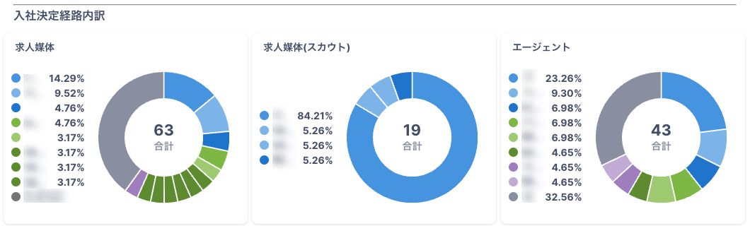 入社決定における「大分類:求人媒体/求人媒体(スカウト)/エージェント」ごとの「小分類:求人媒体名/エージェント名」の内訳が確認できます。