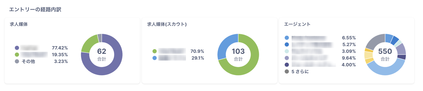 エントリーにおける「大分類:求人媒体/求人媒体(スカウト)/エージェント」ごとの「小分類:求人媒体名/エージェント名」の内訳が確認できます。