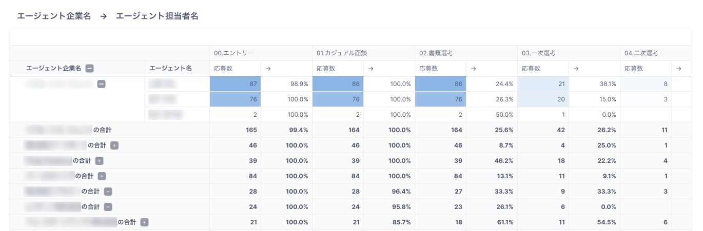 エージェントからの応募をエージェント社名・エージェント担当者名ごとに進捗・歩留まりが確認できます。