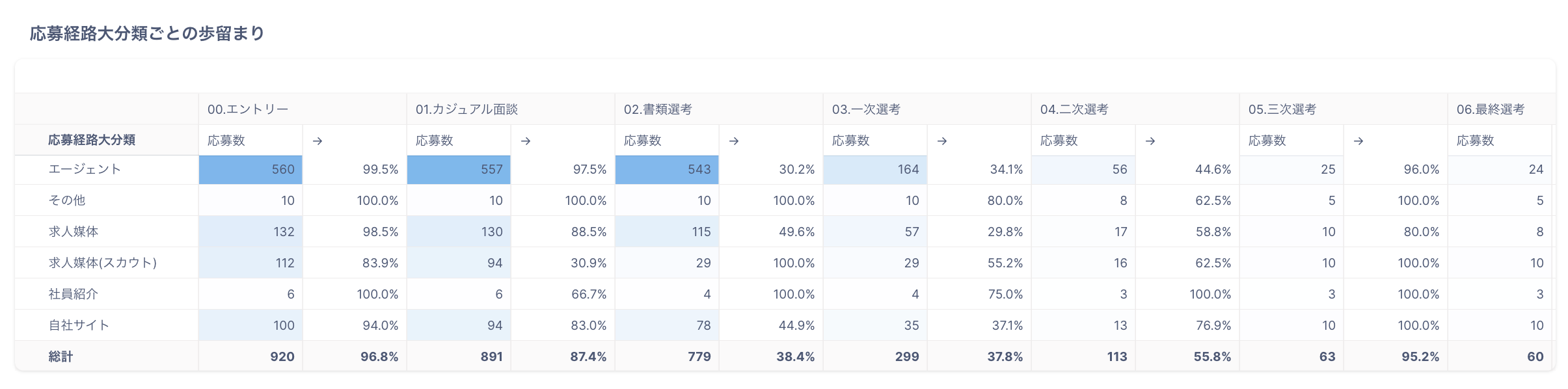 フィルタリングした期間の応募経路大分類ごとの進捗・歩留まりが確認できます。