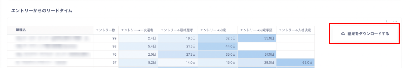 選考ステップ間のリードタイムを確認したい場合は、右上の「…」より「結果をダウンロードする」でCSVデータを取得して加工が可能です。