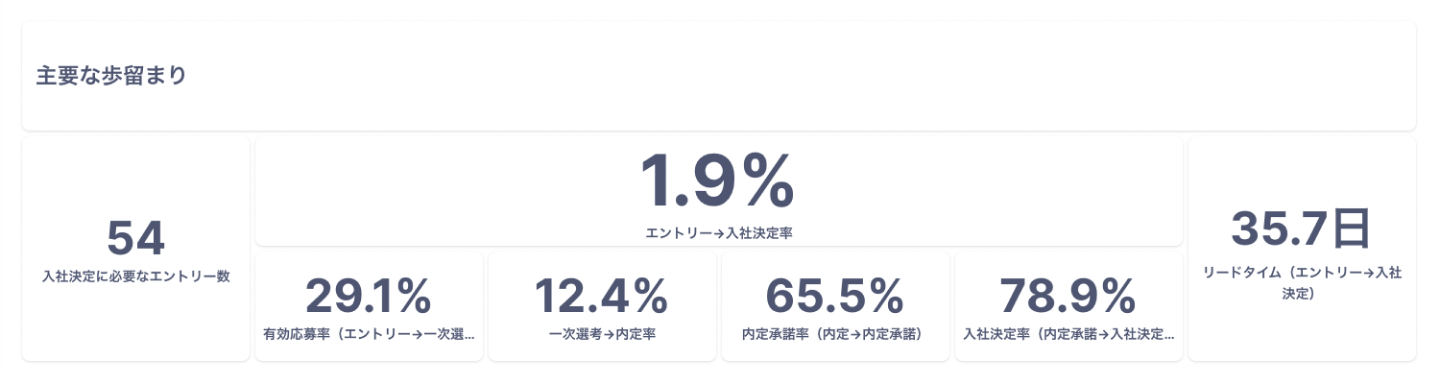 エントリー→入社決定率 | フィルタリングした期間に応募があった候補者のうち、エントリーから入社決定に至った割合 |