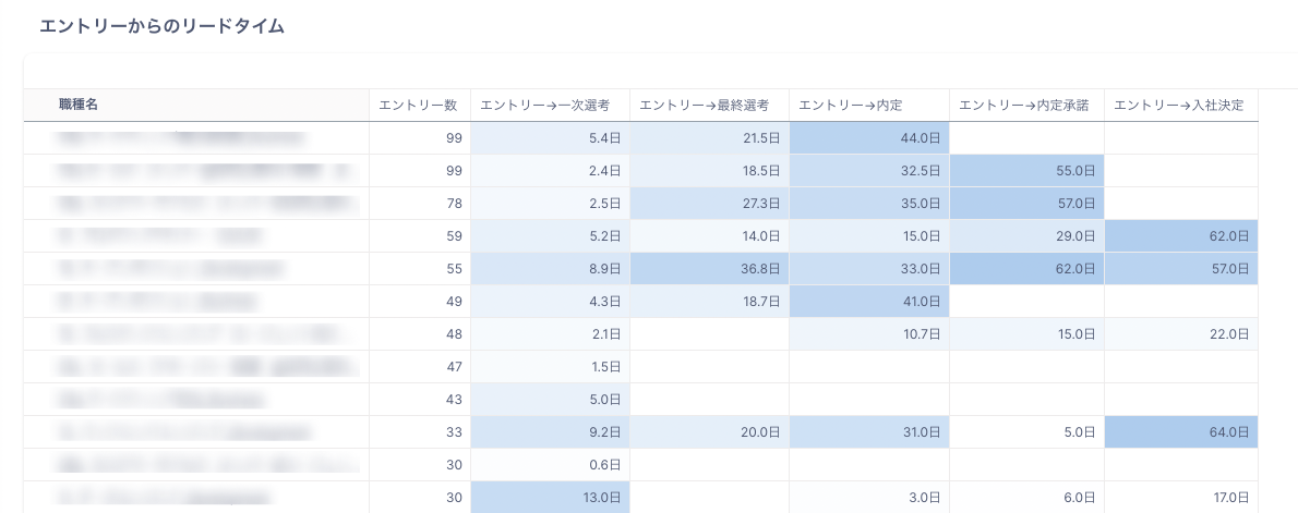 職種別にエントリー日を起点にした各選考ステップまでの平均所要日数(リードタイム)を確認できます。