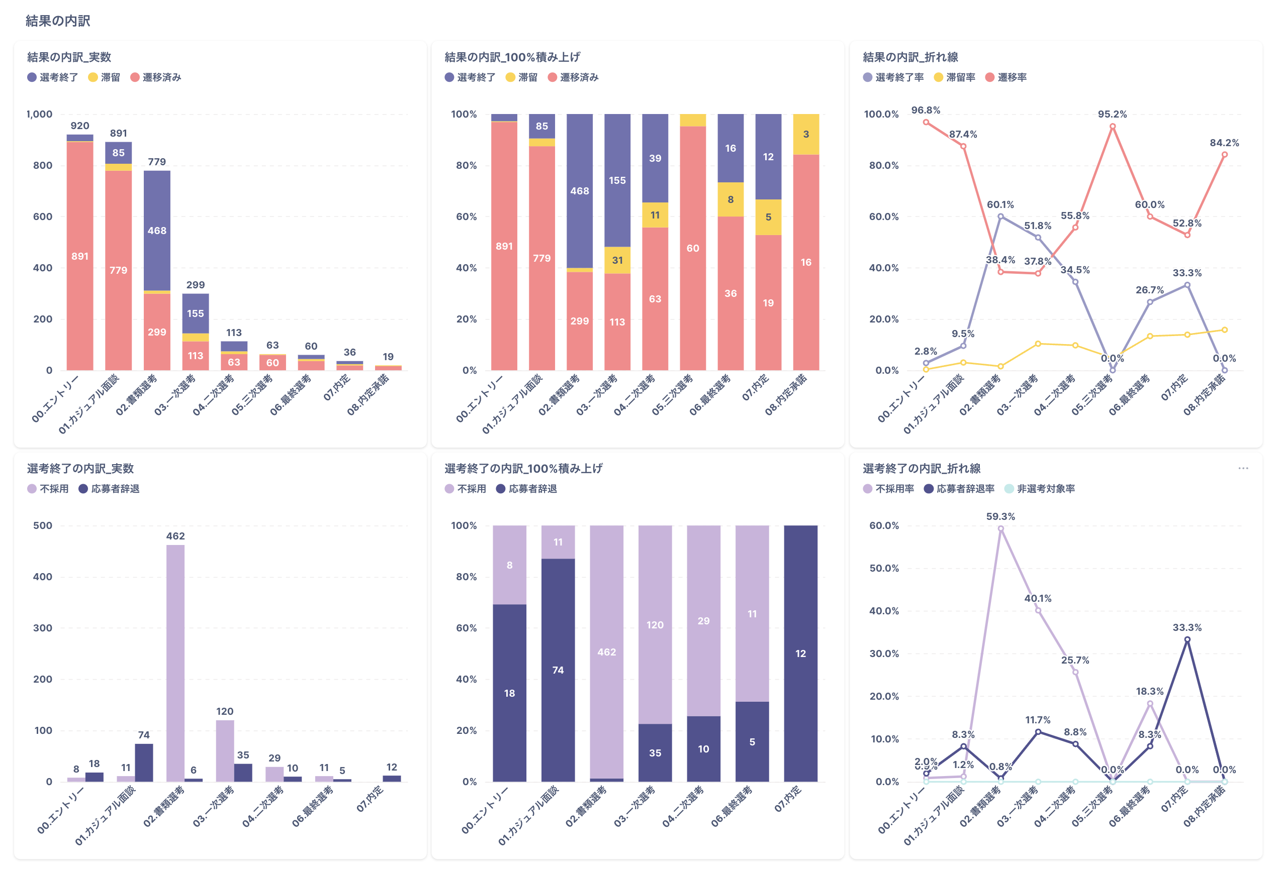 結果の内訳や選考終了理由の詳細をグラフで確認できます。
