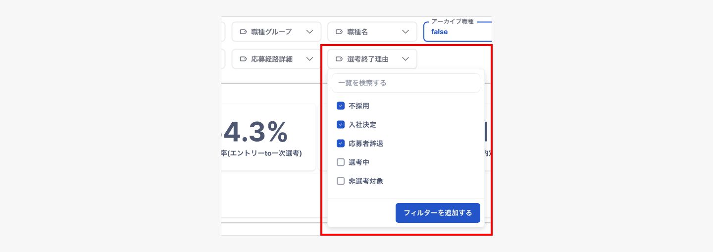 選考中を除いて着地済の応募の進捗だけを確認したい場合は、上部のフィルターから「選考終了理由」を「不採用/入社決定/応募者辞退」に絞り込んでご確認ください。