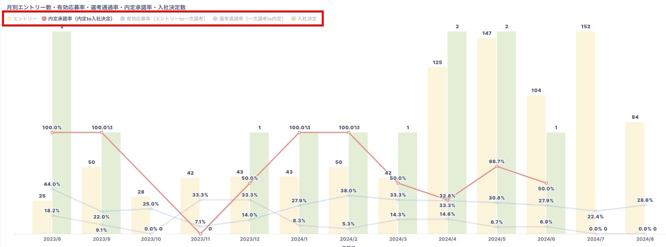 例)「一次選考以降に進んだ応募数」÷ 「エントリー以降に進んだ応募数」