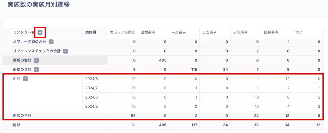 「+」を押すとドリルダウンされ、内訳データごとに表示されます。「ー」を押すとドリルアップされ、閉じられた状態に戻ります。 また、上部のタイトル名(下記画像の場合:「コンタクト名」)横の「+」「ー」で一斉にドリルダウン・ドリルアップが可能です。
