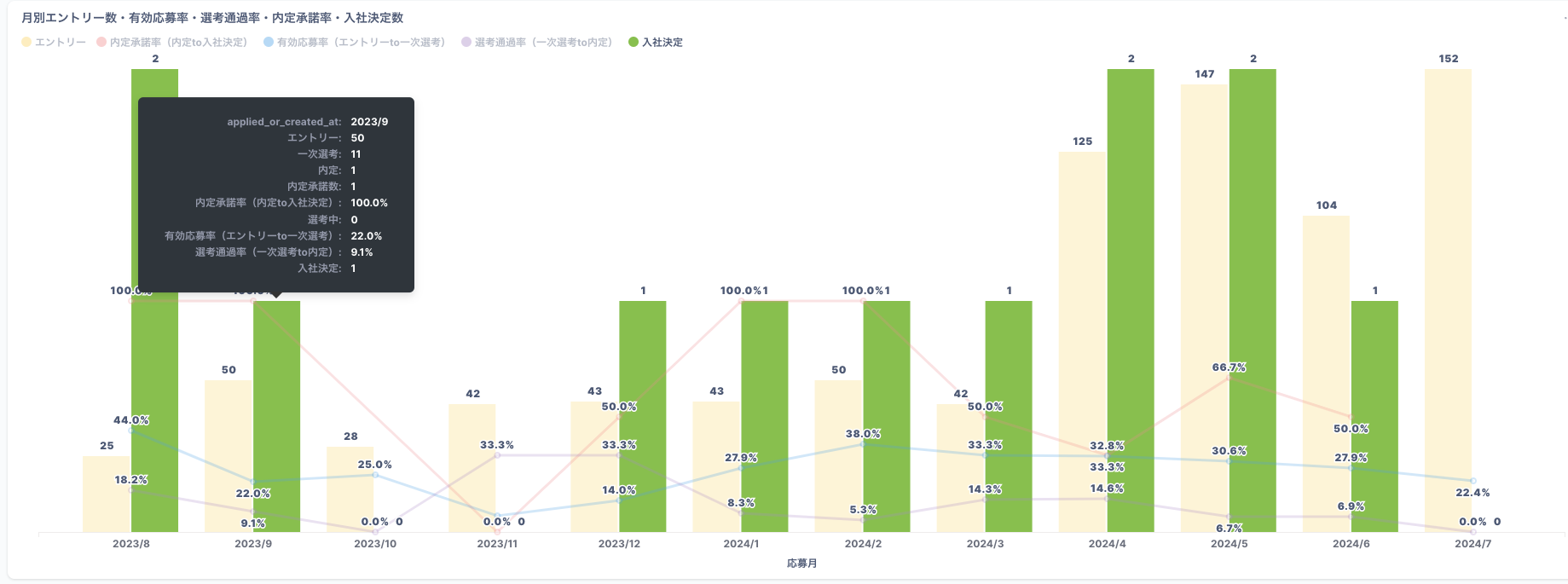 数値をダブルクリックすると該当候補者の一覧が開きます。応募詳細URLをクリックし、該当候補者をバイネームで確認できます。