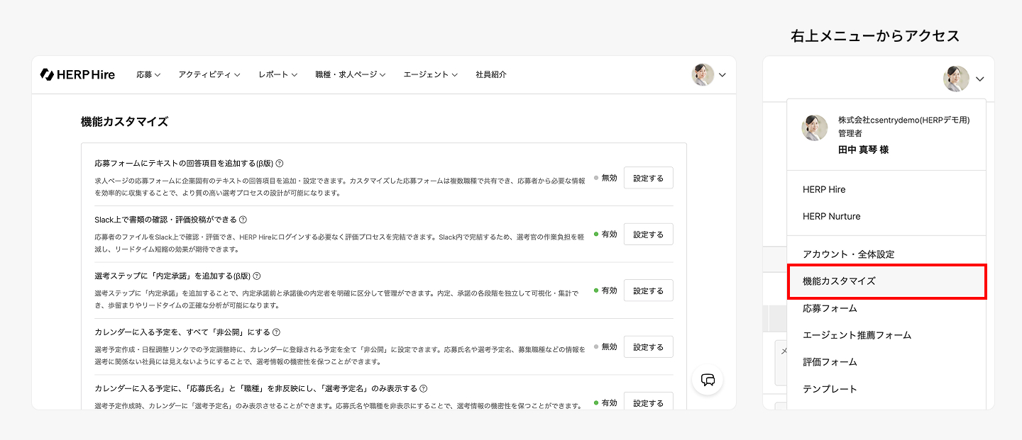 右上メニュー>「機能カスタマイズ」画面から設定してください。