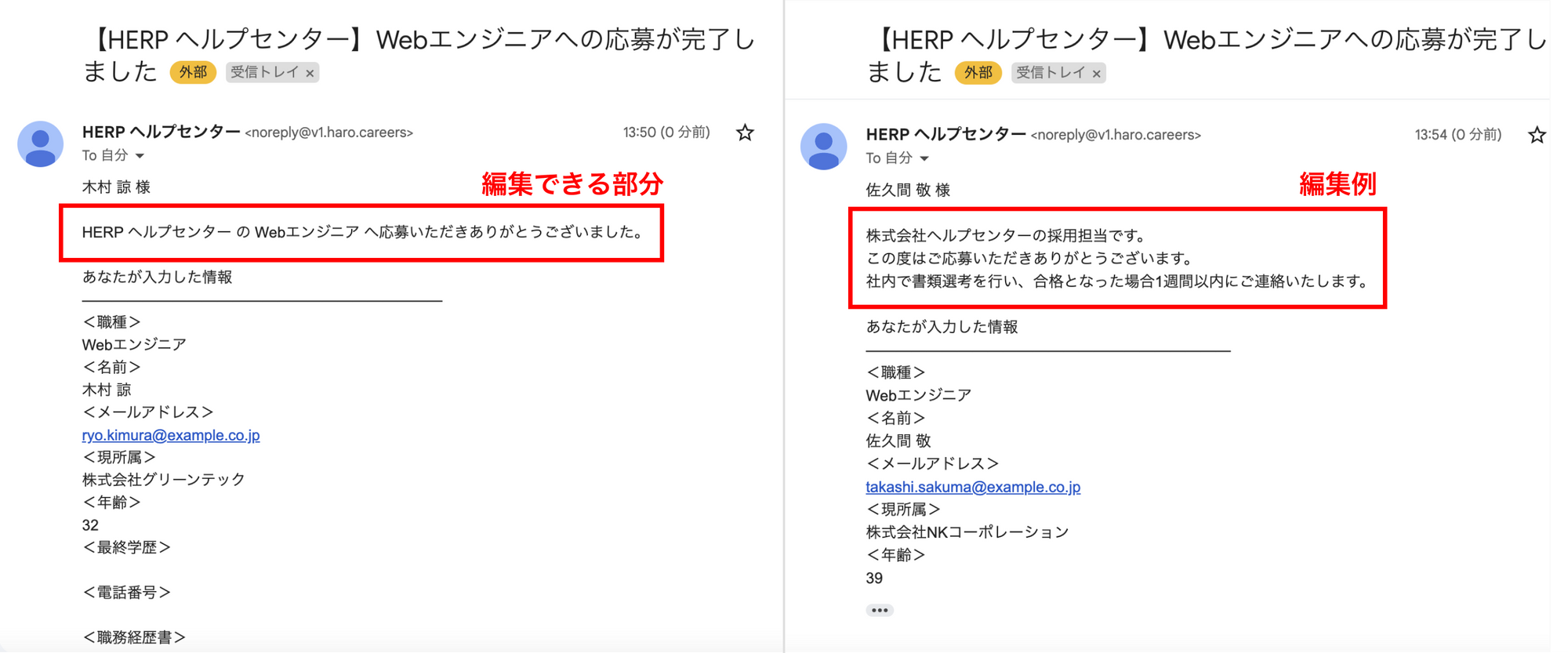 HERP Hire で公開できる求人ページから応募した際に届く、応募完了メールの文面を設定できます。書類選考の合否の連絡の有無や連絡するまでの期間についてのご案内や、応募者への周知が必要な内容を記載することができます。