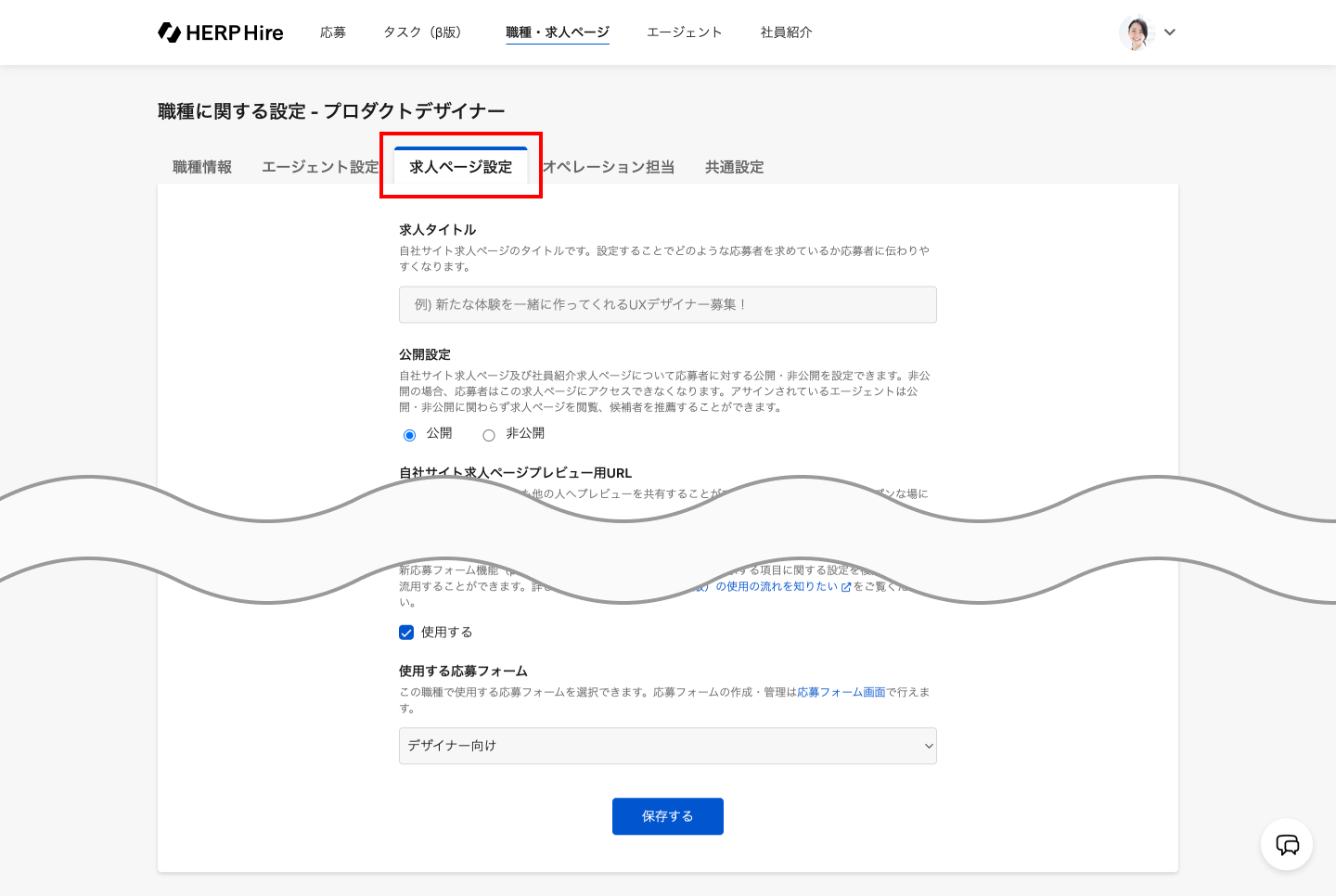 「求人ページ設定」タブをクリックする