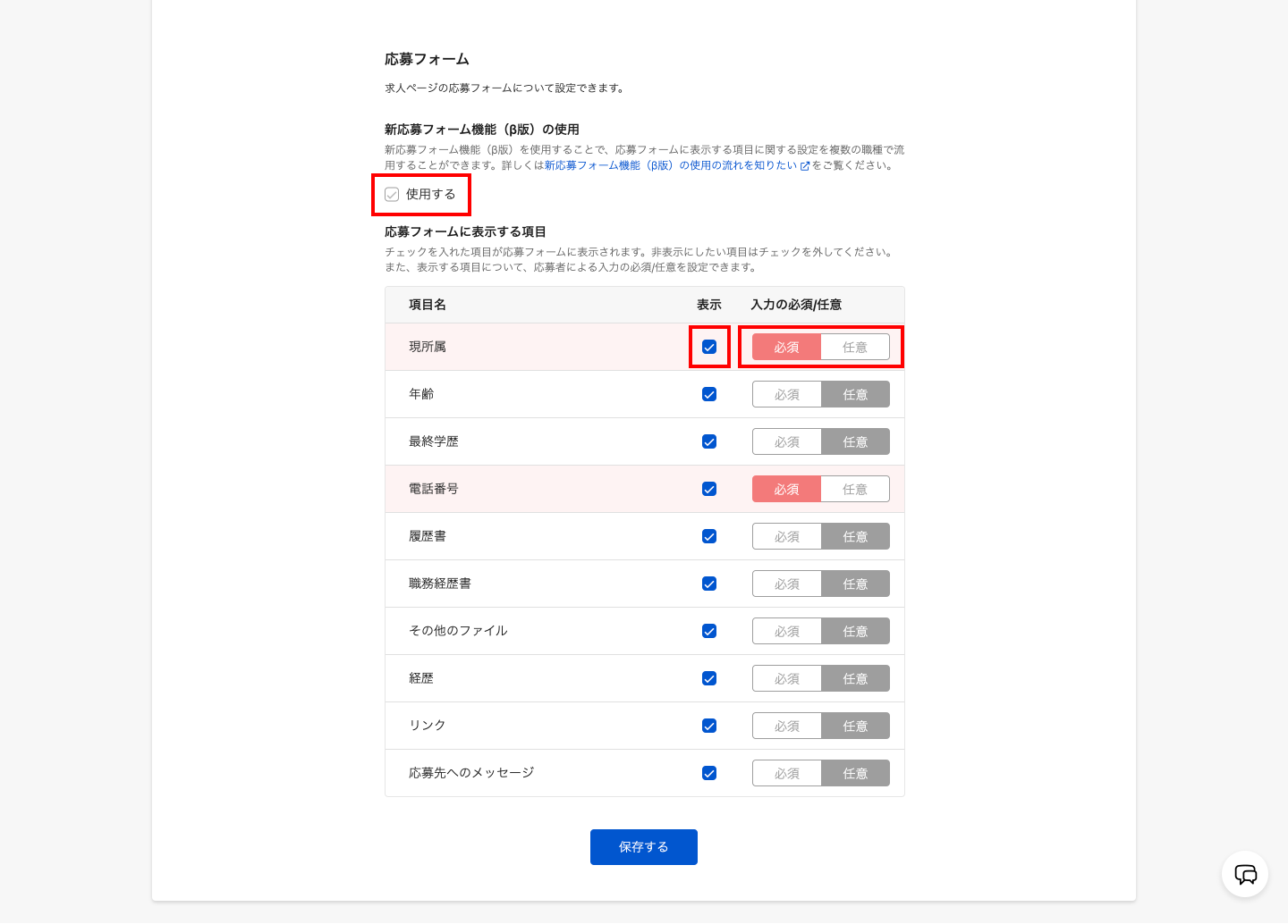 デフォルトの項目を使用する場合は、新応募フォーム「使用する」のチェックを外し、応募フォームに表示する項目にて表示/非表示、必須/任意を編集する