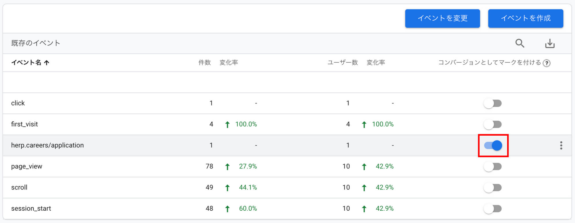 Google アナリティクス上でコンバージョンイベントを設定します。HERP Hire で作成した求人ページから送信されたカスタム イベントに、コンバージョンとしてマークを付けます。詳しくは[GA4] コンバージョン イベントのセットアップと管理をご覧ください。