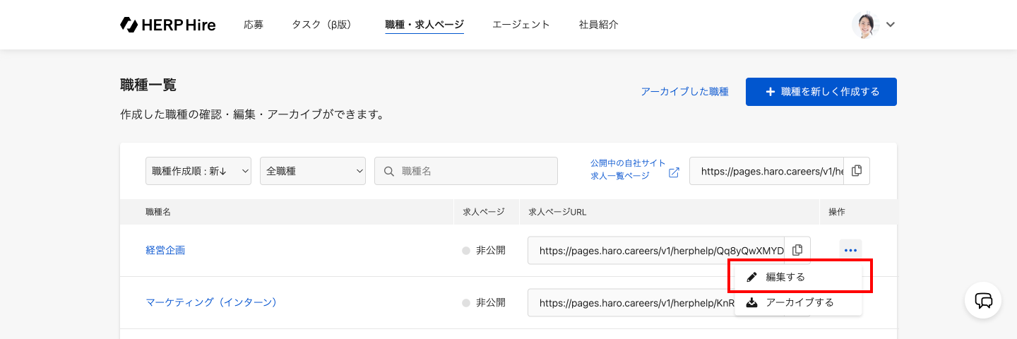 職種一覧を開き、編集したい職種の「…」アイコンから「編集する」をクリックする