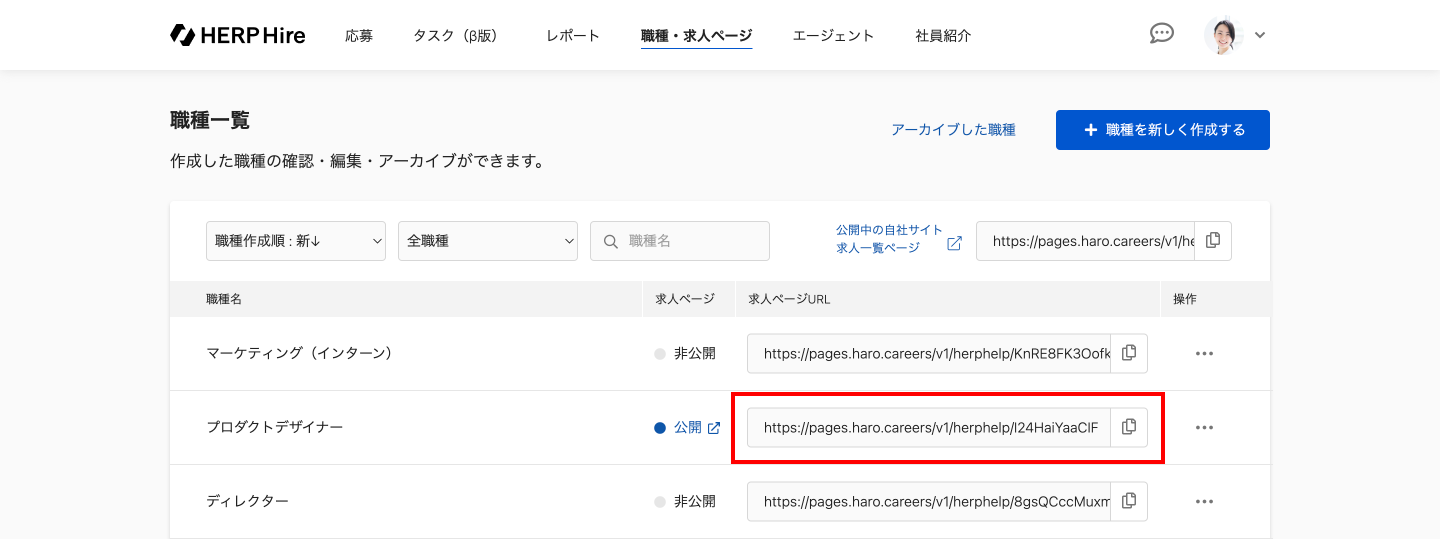 公開中の職種を候補者や採用サイト等に共有したい場合は、求人ページURLを使用してください。求人ページURLは、職種一覧で取得できます。
