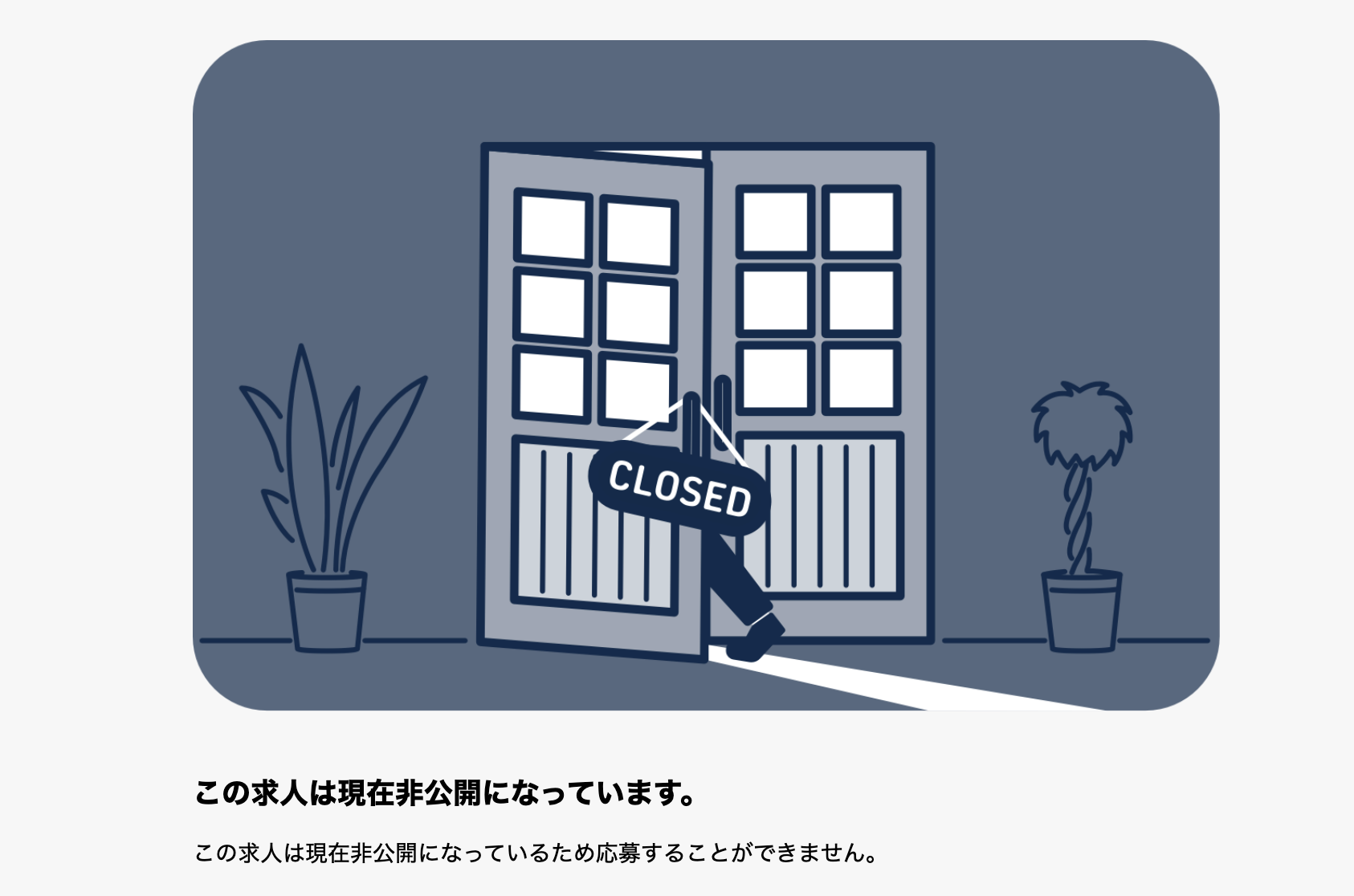 非公開にした状態で候補者が求人ページのURLにアクセスすると、以下のような画面が表示されます。