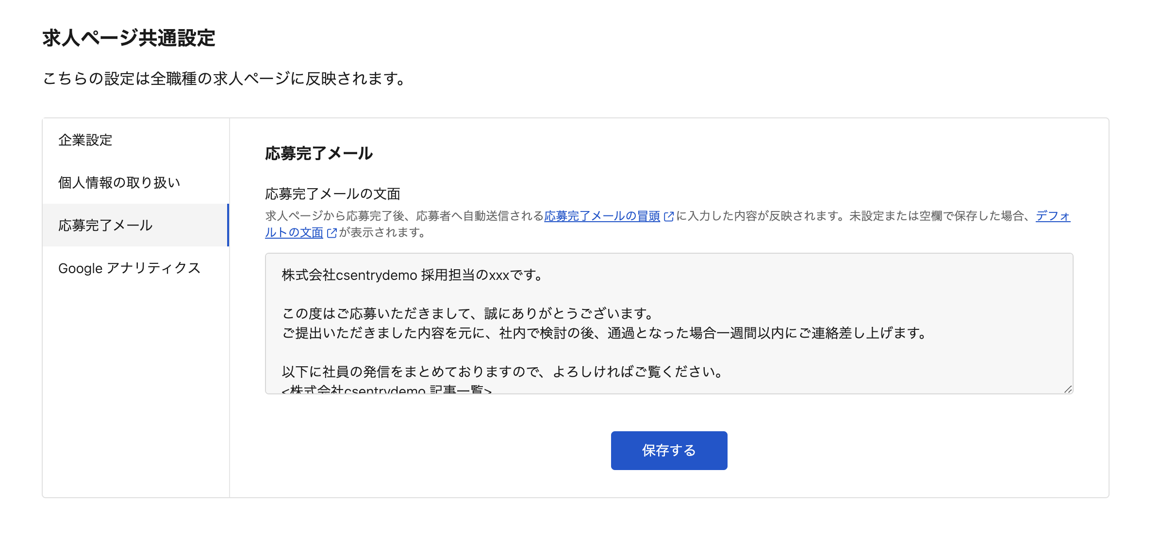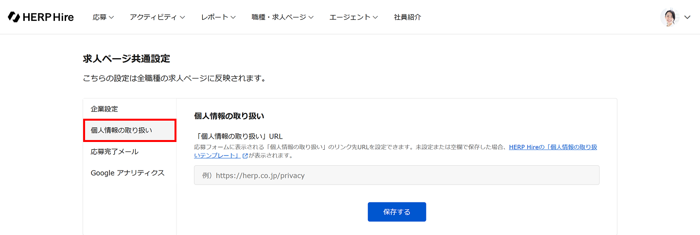 未設定または空欄で保存した場合、HERP Hireの「個人情報の取り扱いテンプレート」が表示されます。