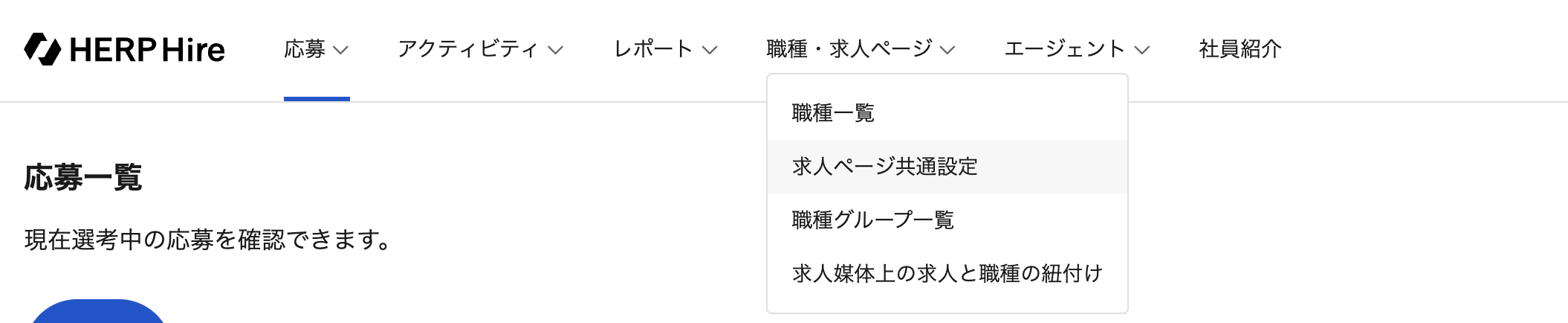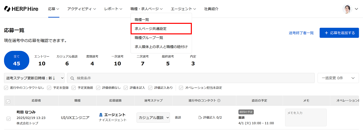 株式会社〇〇(企業名)の △△(職種名) へ応募いただきありがとうございました。メニューバーにある「職種・求人ページ」から「求人ページ共通設定」をクリックします。