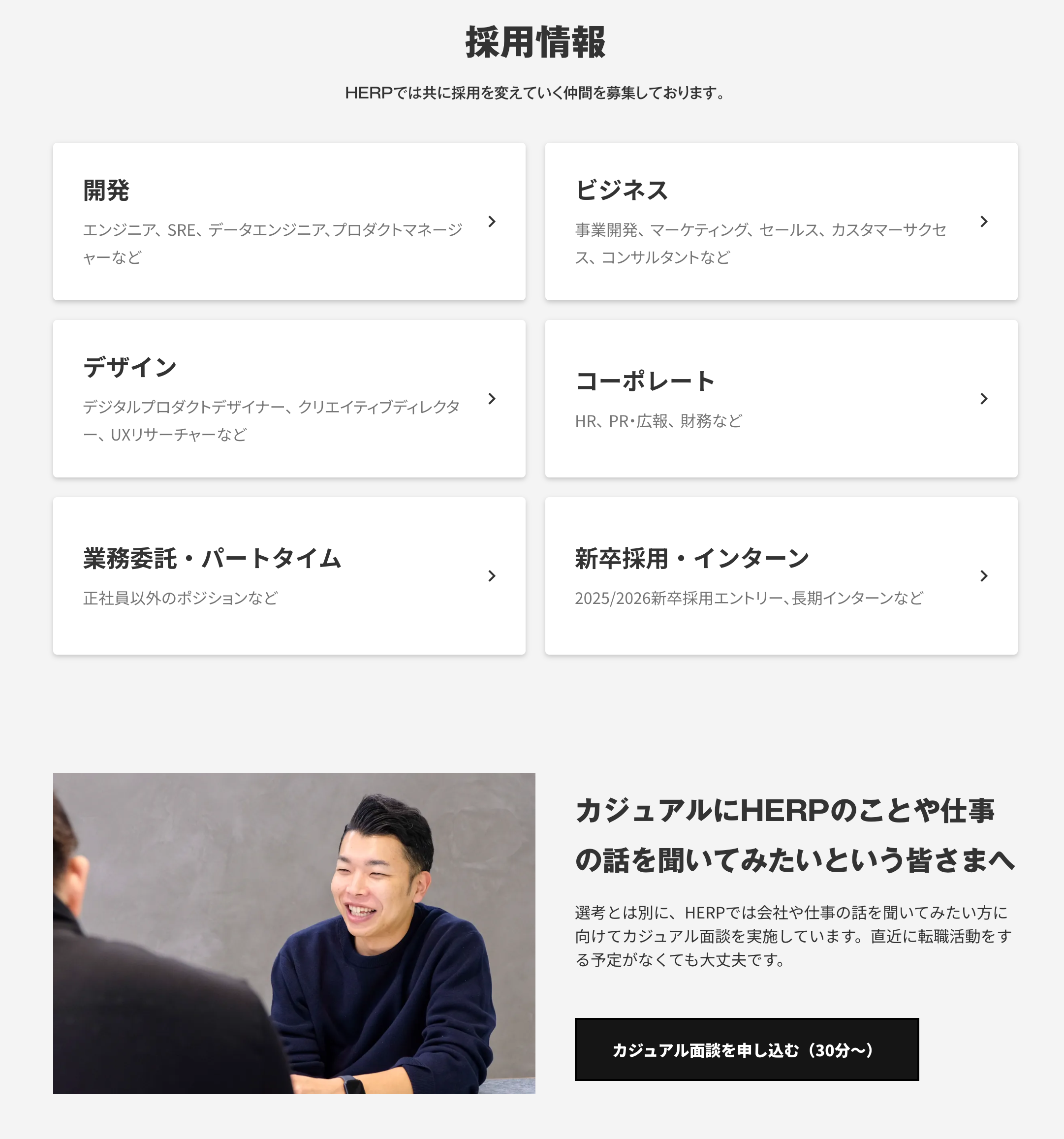 HERPでは職種グループ別の動線(開発、ビジネス、デザイン〜)と、カジュアル面談を申し込むにURLを設定しています。※2025年3月現在