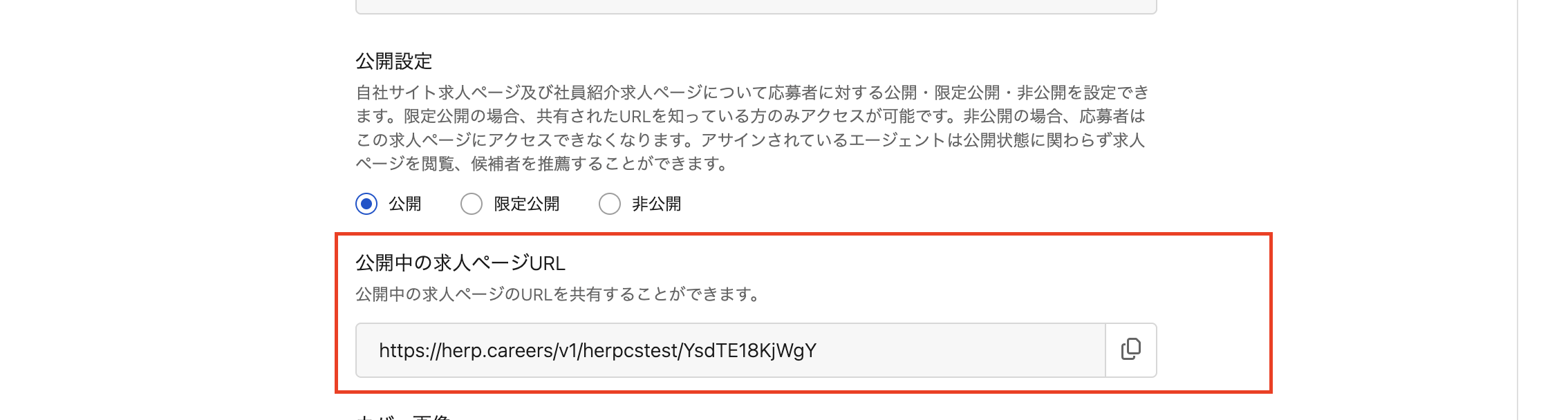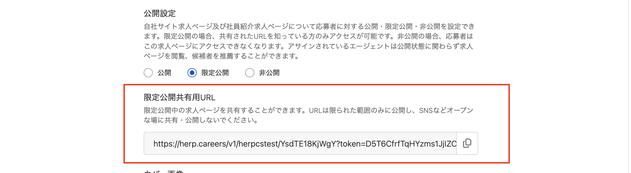 限定公開:一般には公開しない求人を、特定の相手にだけ共有するために設定します。限定公開共有用のURLを知っている人のみ求人を閲覧・応募できます。