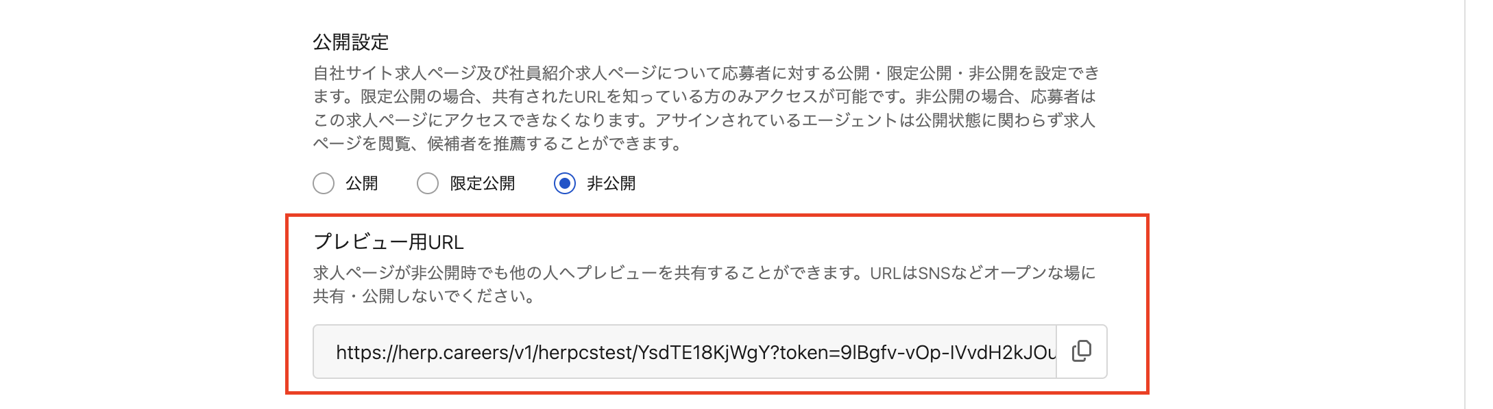 限定公開中の求人を一度非公開にした後、再公開すると、新たな限定公開共有用URLが発行されます。