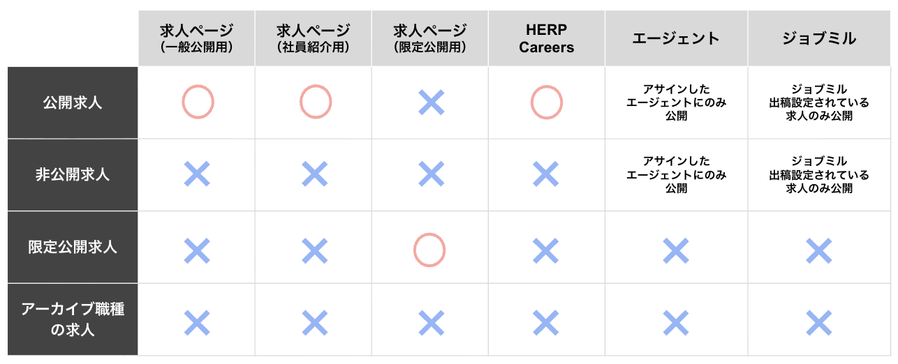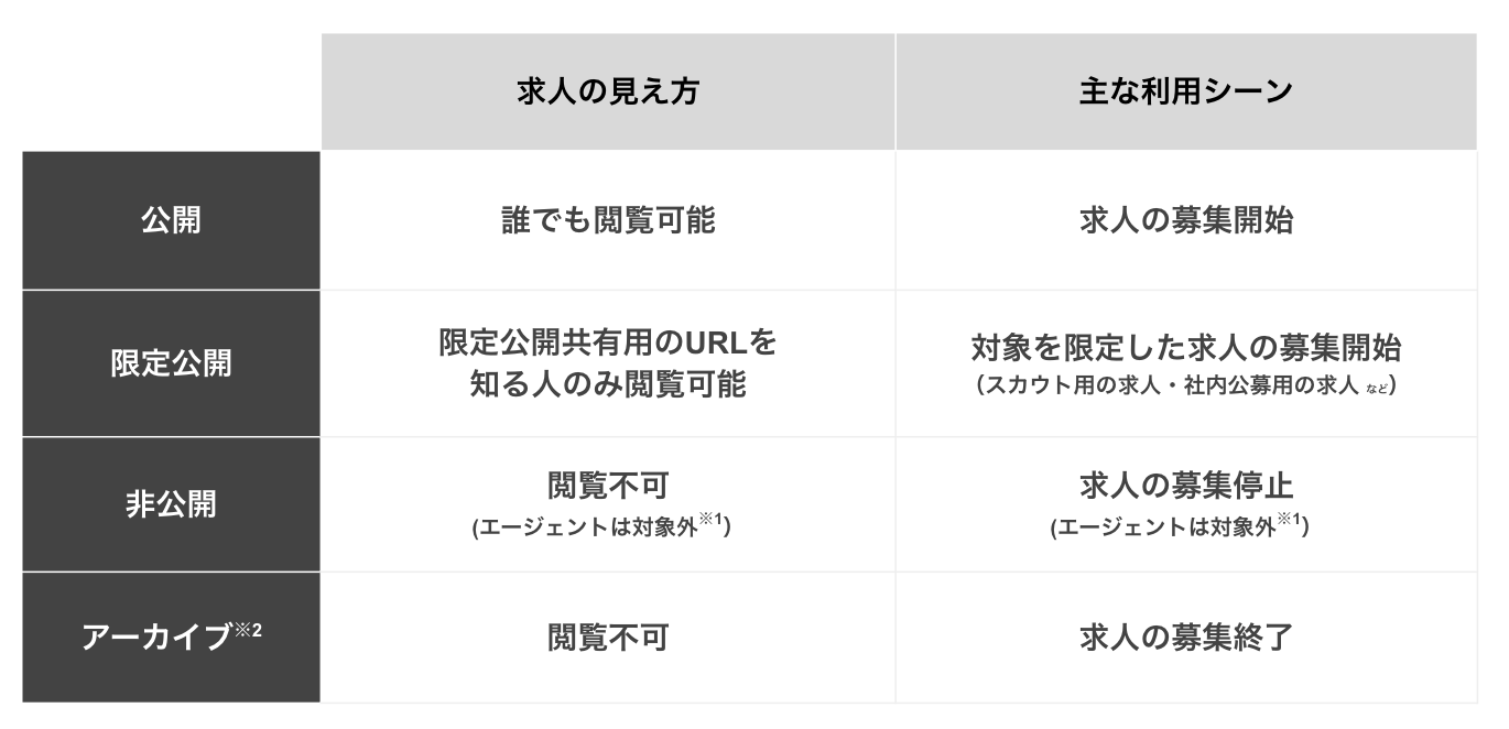 ※1 エージェントをアサイン、またはジョブミルに出稿している場合、「非公開」の状態でもエージェントは求人の閲覧・推薦が可能です。※2「公開」「非公開」「限定公開」は求人ページ設定から設定できますが、「アーカイブ」のみ職種一覧の操作メニューから設定します。