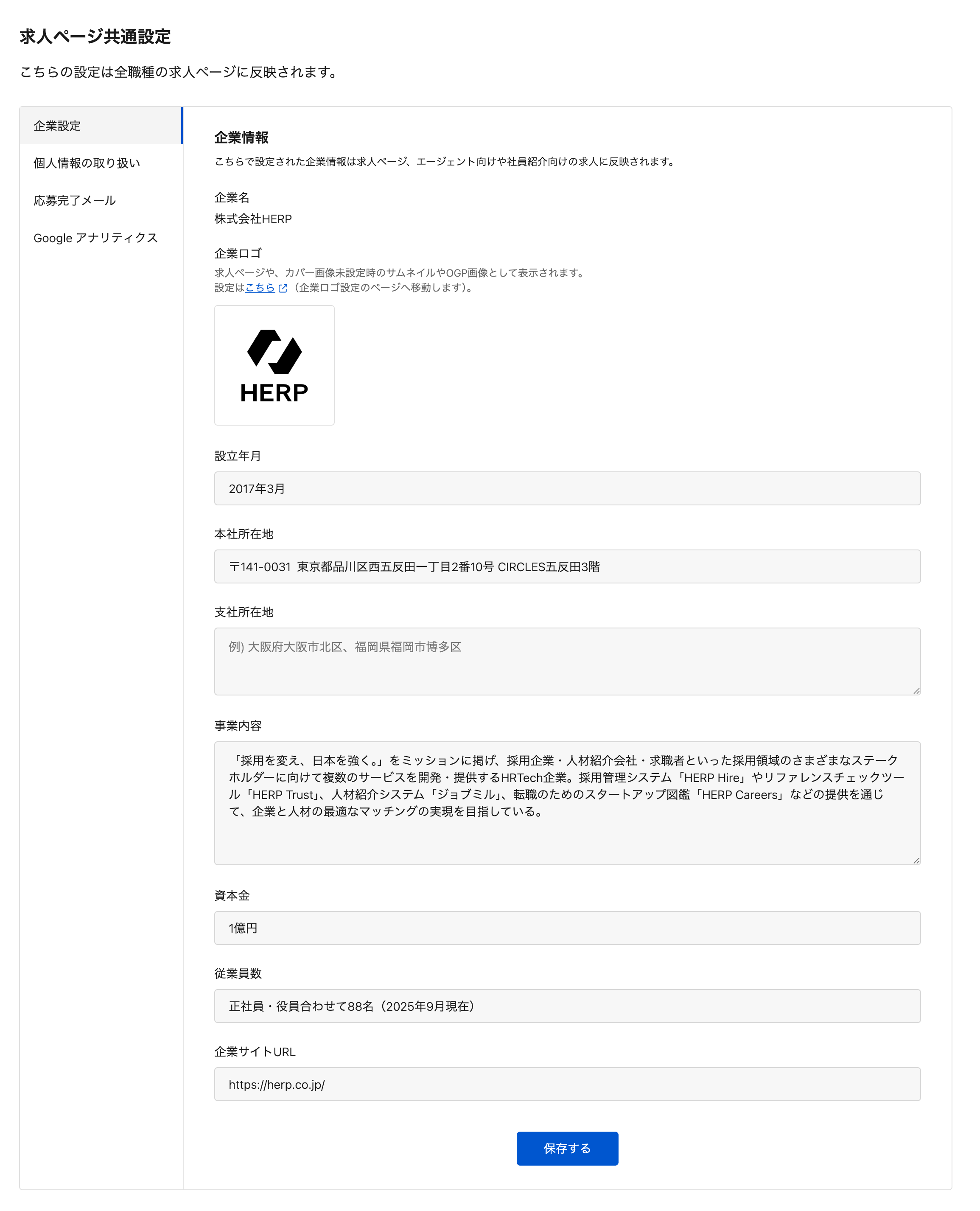 求人ページ共通設定で設定された企業情報は求人ページに反映されます。