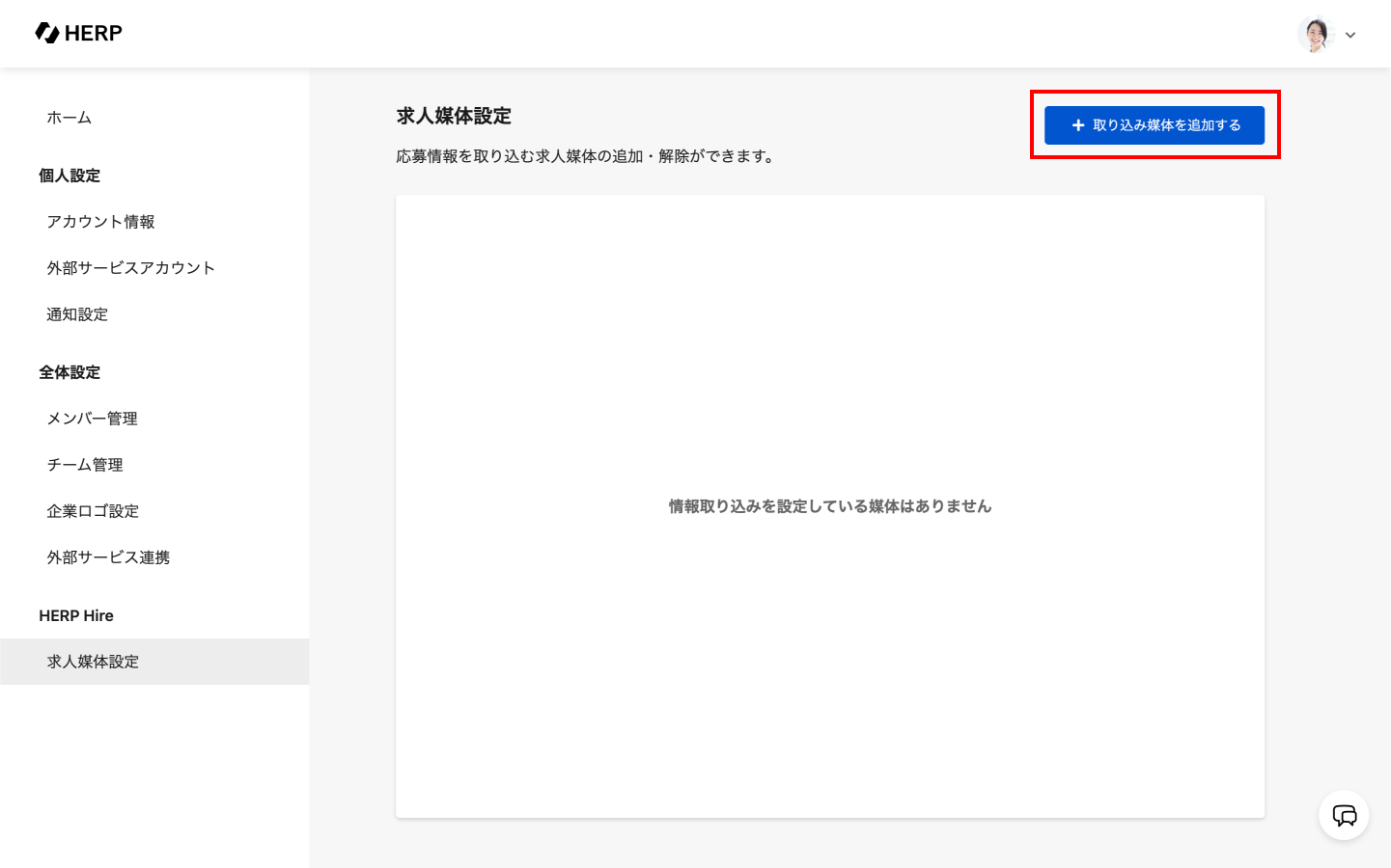管理画面(アカウント・全体設定)の「求人媒体設定」で、「取り込み媒体を追加する」をクリックします。