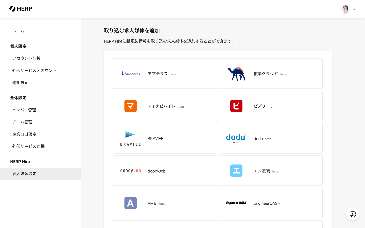 取り込む求人媒体を選択し、表示される手順に沿って連携を完了します。