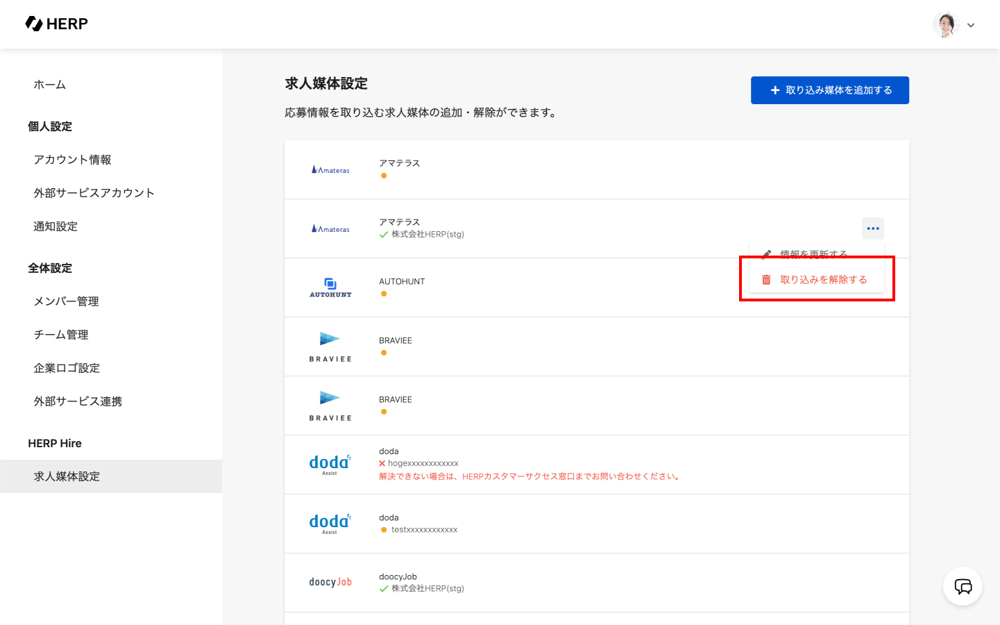 1.媒体連携トークンにより応募情報を取り込む媒体(求人媒体設定の画面でロゴが"表示されている"もの)