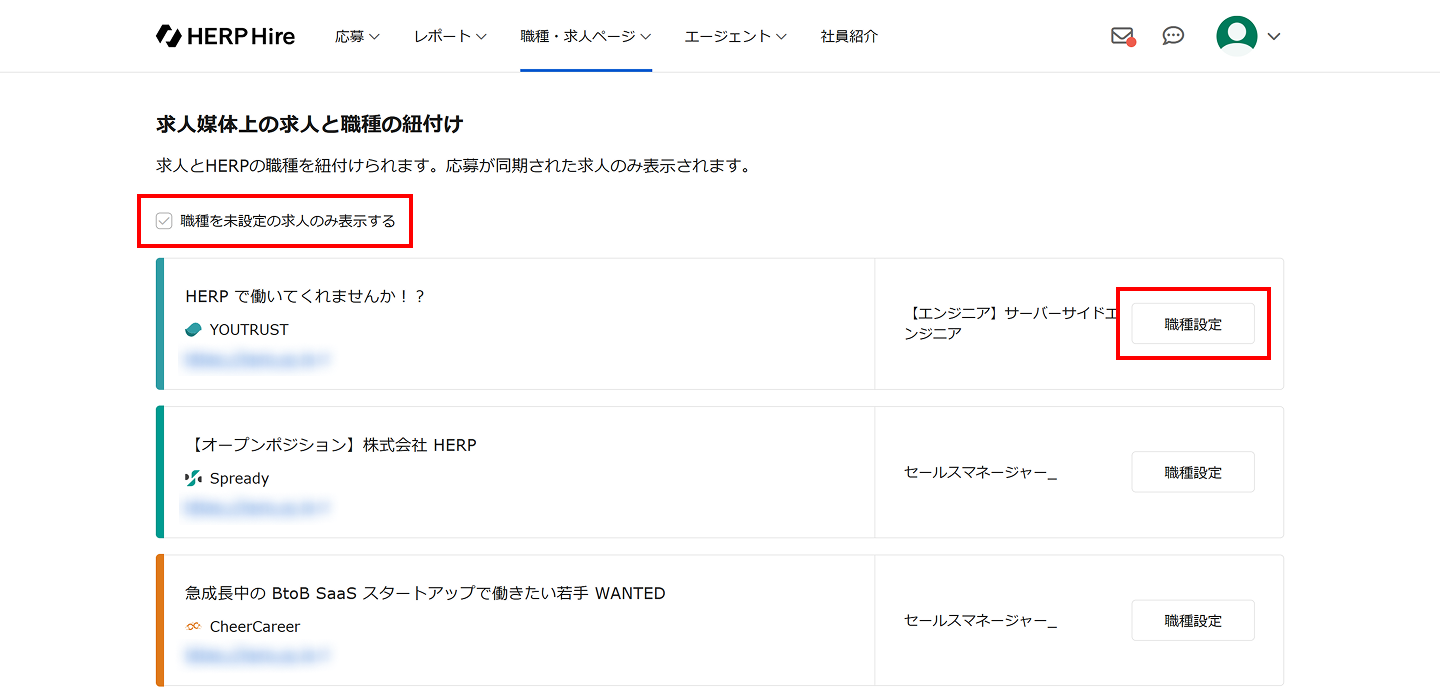 「職種設定」ボタンからHERP Hire内に作成済みの職種を求人に紐付けることができます。チェックボックスにチェックを入れることにより、職種を紐づけていない求人のみ表示することもできます。