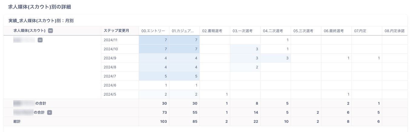 応募経路別の各ステップ変更日データにより各選考ステップの実績値を月ごとに詳しく確認することが可能です。