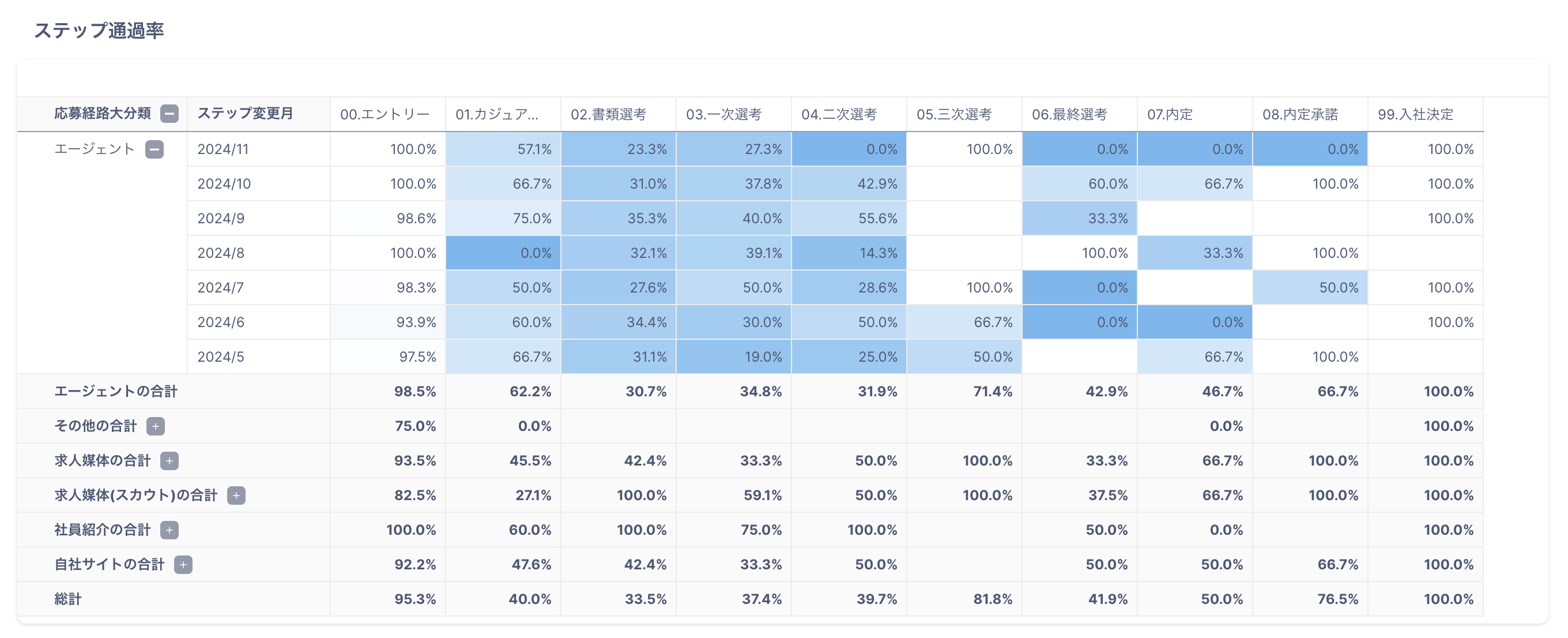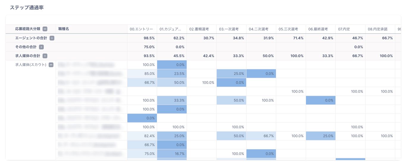 応募経路×職種ごとにステップ通過率を確認することが可能です。