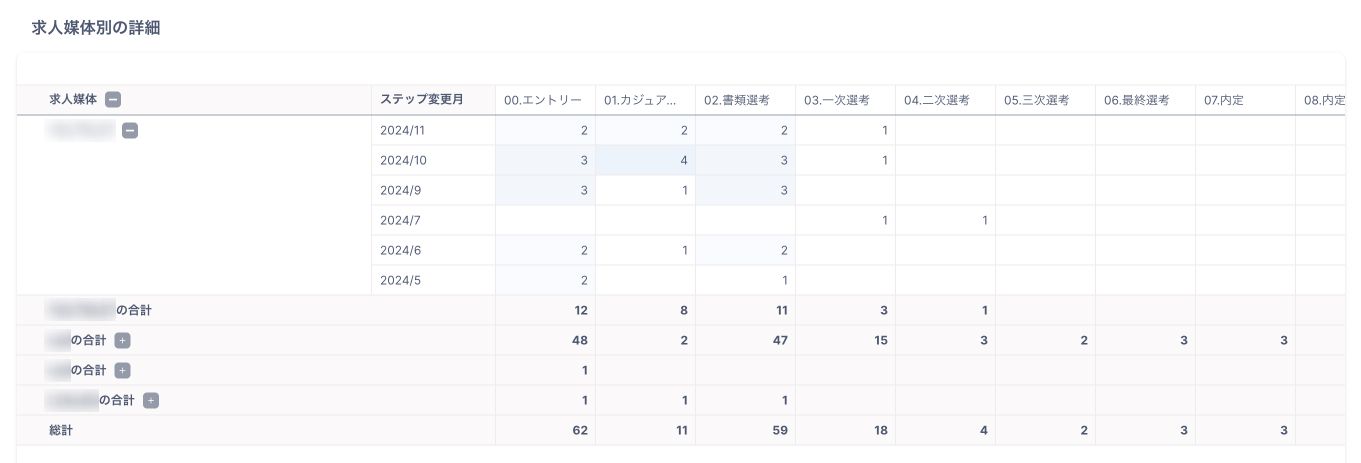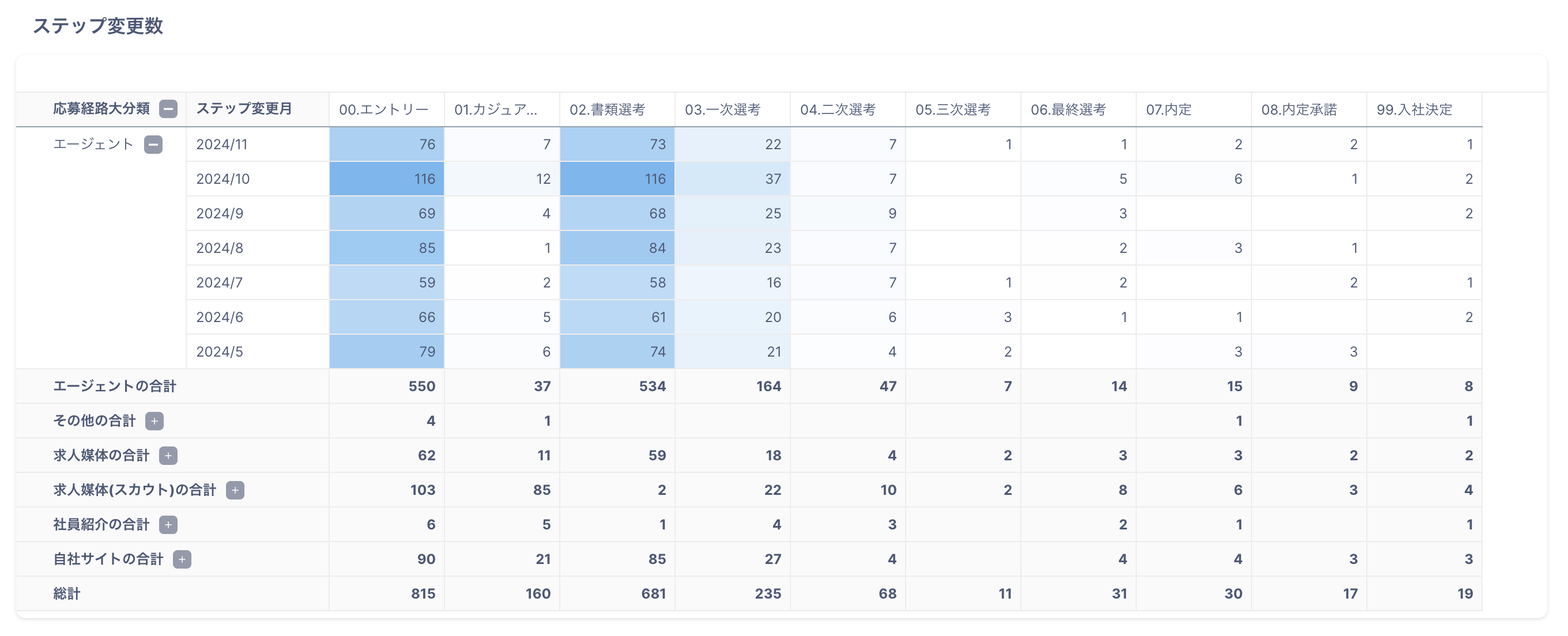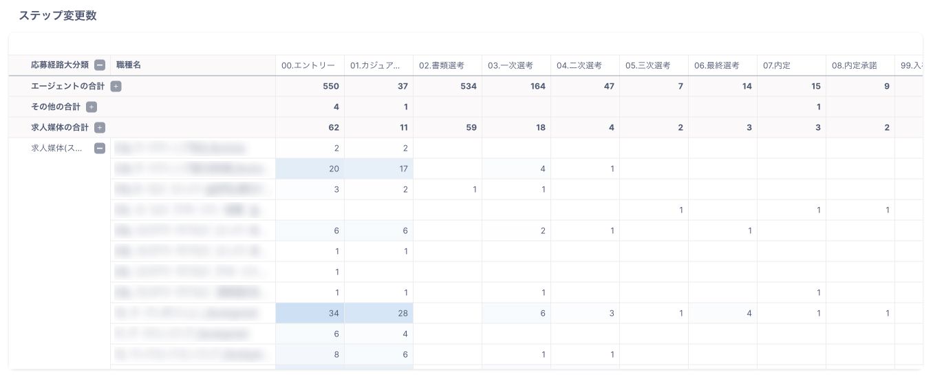応募経路×職種ごとにステップ変更数を確認することが可能です。